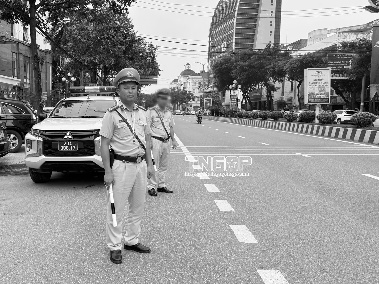 Trung tá Lao Hoàng Hải trong một buổi tuần tra, kiểm soát đảm bảo trật tự an toàn giao thông tại phường Phan Đình Phùng, tỉnh Thái Nguyên năm 2025