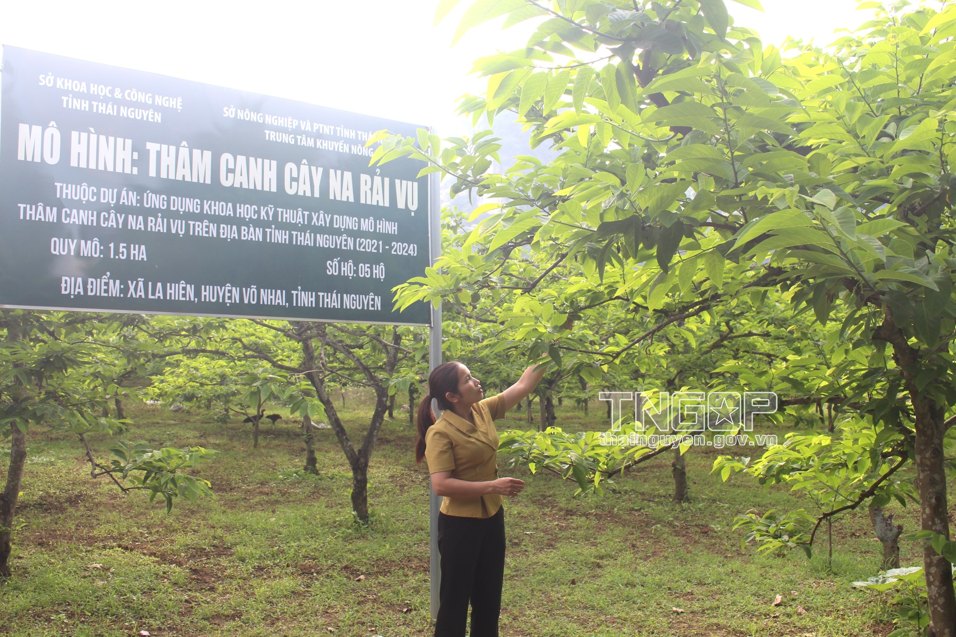 Dự án Khoa học và Công nghệ cấp tỉnh “Ứng dụng khoa học kỹ thuật thâm canh cây na rải vụ trên địa bàn tỉnh Thái Nguyên” được Trung tâm Khuyến nông Thái Nguyên triển khai thực hiện trong 3 năm (từ tháng 10/2021 - 10/2024) tại 2 xã La Hiên và Phú Thượng (Võ Nhai) với quy mô 3 ha. Mục tiêu của Dự án là ứng dụng khoa học kỹ thuật xây dựng thành công mô hình thâm canh cây na rải vụ chất lượng cao, kéo dài thời gian thu hoạch trong năm nhằm đáp ứng nhu cầu thị trường. Theo đó, năm thứ nhất mô hình áp dụng các biện pháp kỹ thuật đốn, tỉa rải vụ luôn trên những cây đủ điều kiện, còn lại tiến hành chăm sóc phục hồi cây; năm thứ hai và thứ ba tiếp tục thực hiện toàn bộ các biện pháp rải vụ na.