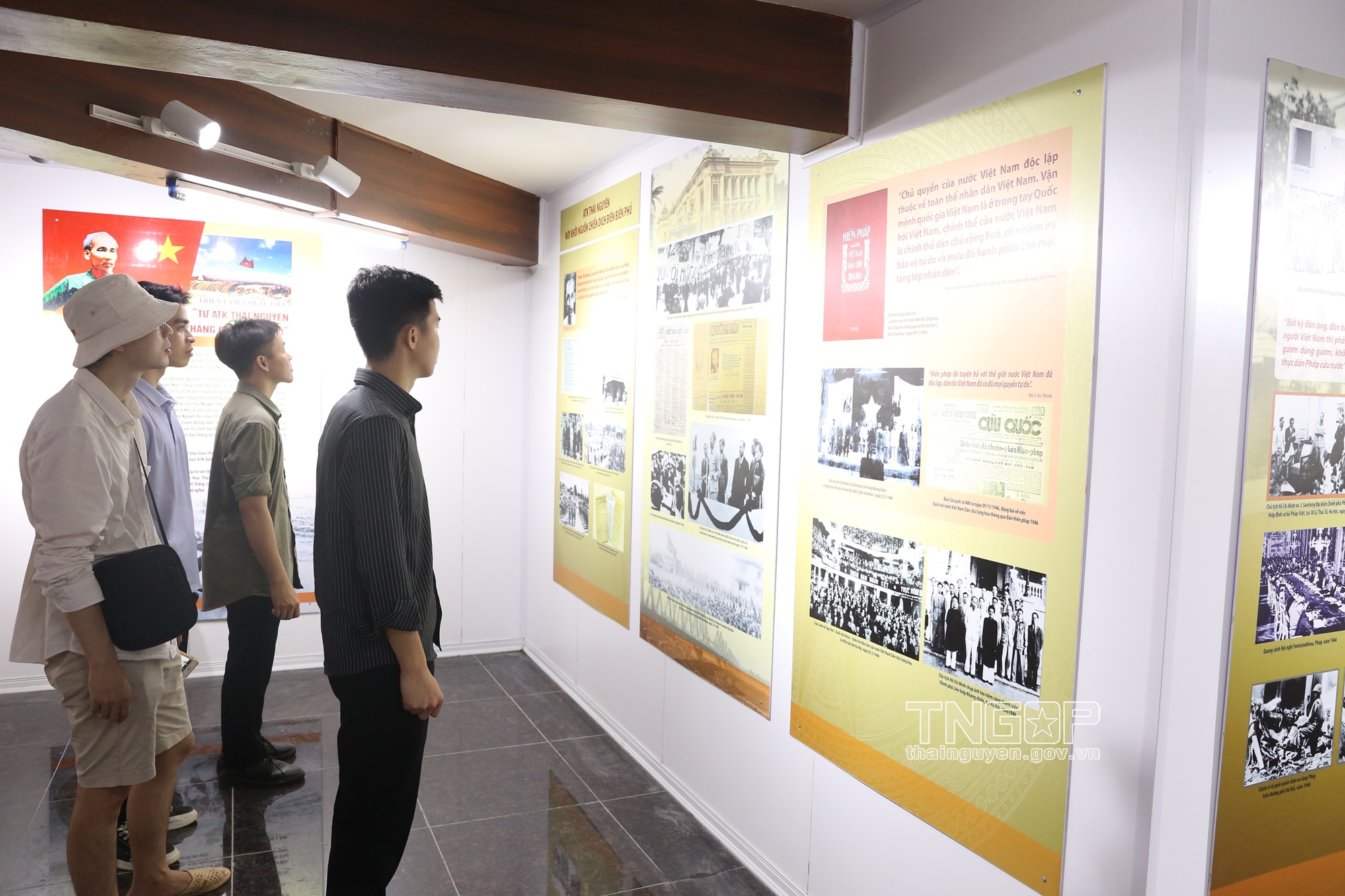 Các bạn trẻ dành thời gian của kỳ nghỉ Lễ 30/4 - 1/5 để tìm hiểu lịch sử tại Triển lãm ảnh "Từ ATK Thái Nguyên đến Chiến thắng Điện Biên Phủ" được trưng bày tại Nhà tưởng niệm Chủ tịch Hồ Chí Minh trên đỉnh Đèo De, xã Phú Đình