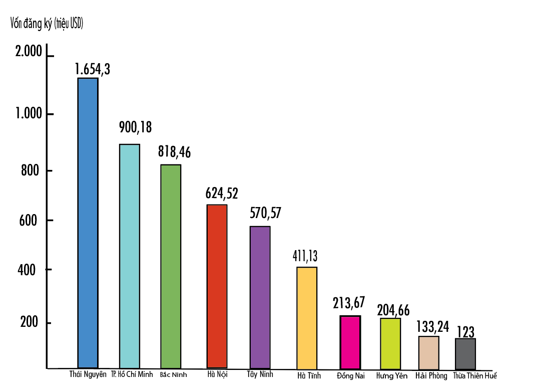 Đáng chú ý, bức tranh thu hút FDI tại các địa phương trong giai đoạn này đã có sự thay đổi rõ nét khi Thái Nguyên đã vượt qua TP. Hồ Chí Minh và Bắc Ninh để trở thành địa phương thu hút FDI nhiều nhất cả nước.
