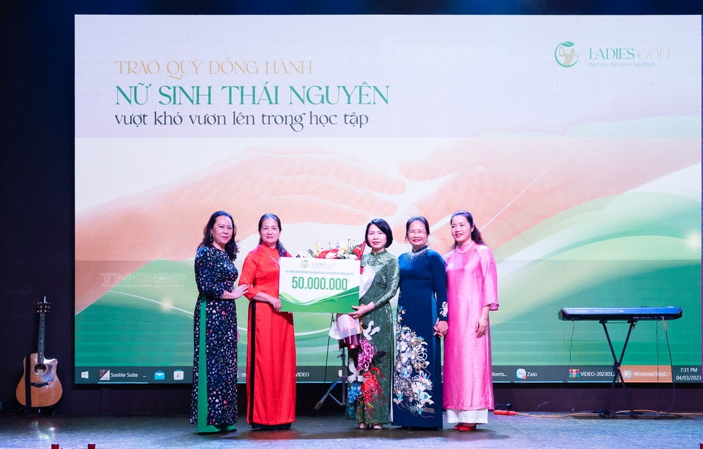 Nhân dịp này, các hội viên CLB Ladies golf Thái Nguyên đã trao số tiền ủng hộ 50 triệu đồng vào Quỹ đồng hành nữ sinh Thái Nguyên vượt khó vươn lên trong học tập.