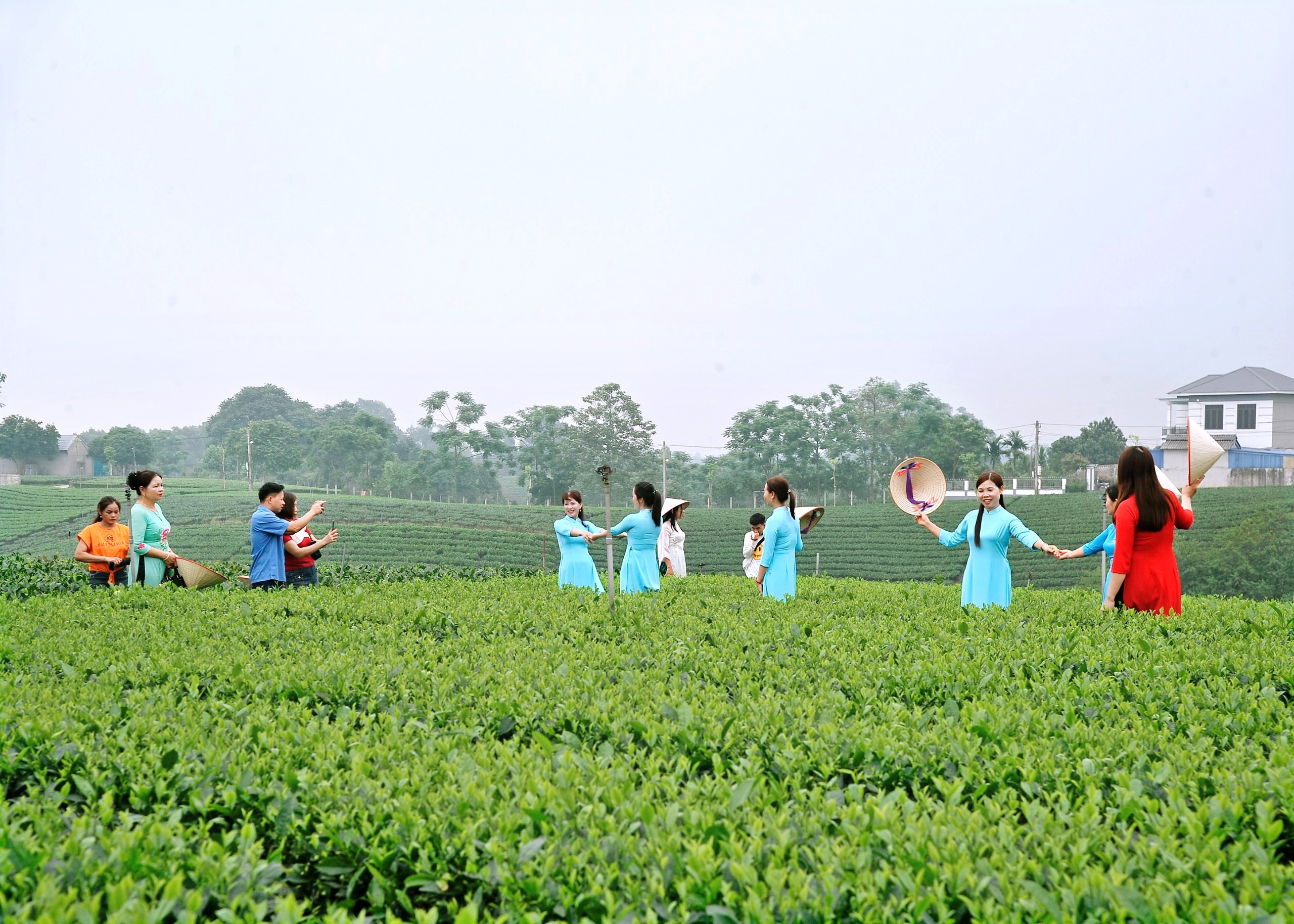 Kinh tế tư nhân cùng với kinh tế nhà nước, kinh tế tập thể là tập hợp nòng cốt để xây dựng nền kinh tế tự chủ, tự lực, tự cường (Ảnh: Du khách thăm quan và chụp ảnh lưu niệm tại Vùng chè Tân Linh, Đại Từ, Thái Nguyên