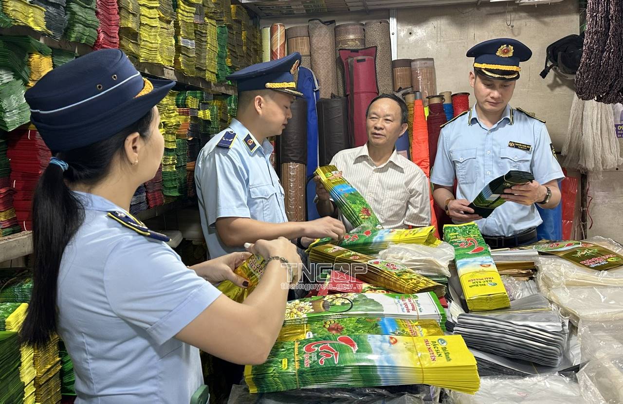 Lực lượng Quản lý thị trường kiểm tra hộ kinh doanh bao bì, túi đựng trà tại Chợ Thái, TP. Thái Nguyên
