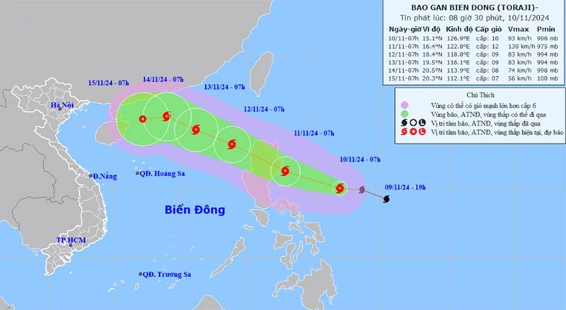 Theo Trung tâm Dự báo khí tượng thủy văn quốc gia, sáng nay (10/11), trên vùng biển phía đông đảo Luzon (Philippines) xuất hiện cơn bão mới có tên quốc tế là Toraji. Sức gió mạnh nhất vùng gần tâm bão mạnh cấp 10 (89-102km/giờ), giật cấp 12.