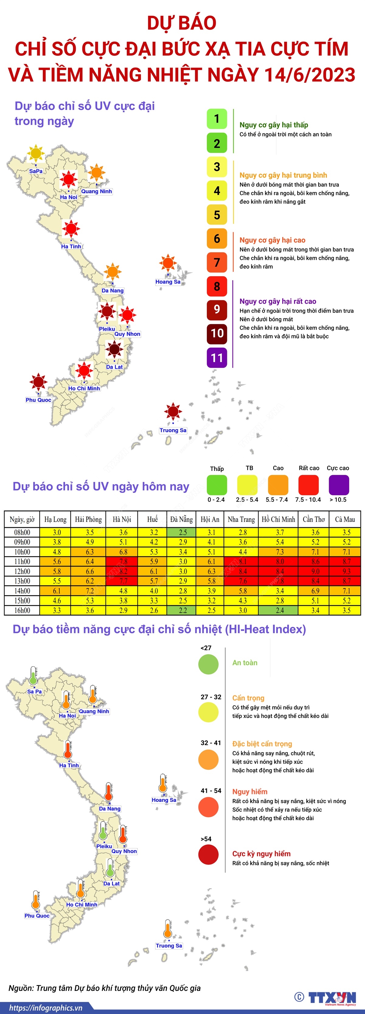 Theo Trung tâm Dự báo khí tượng thủy văn quốc gia, trong ngày 14/6/2023, các thành phố bao gồm Hà Nội, Nha Trang và các thành phố miền Nam đều có chỉ số UV cao nhất trong ngày ở mức rất cao, Hạ Long, Hải Phòng Hội An đều đạt mức cao, thời gian xảy ra trong khoảng từ 11 - 14h; riêng Đà Nẵng đạt mức trung bình.