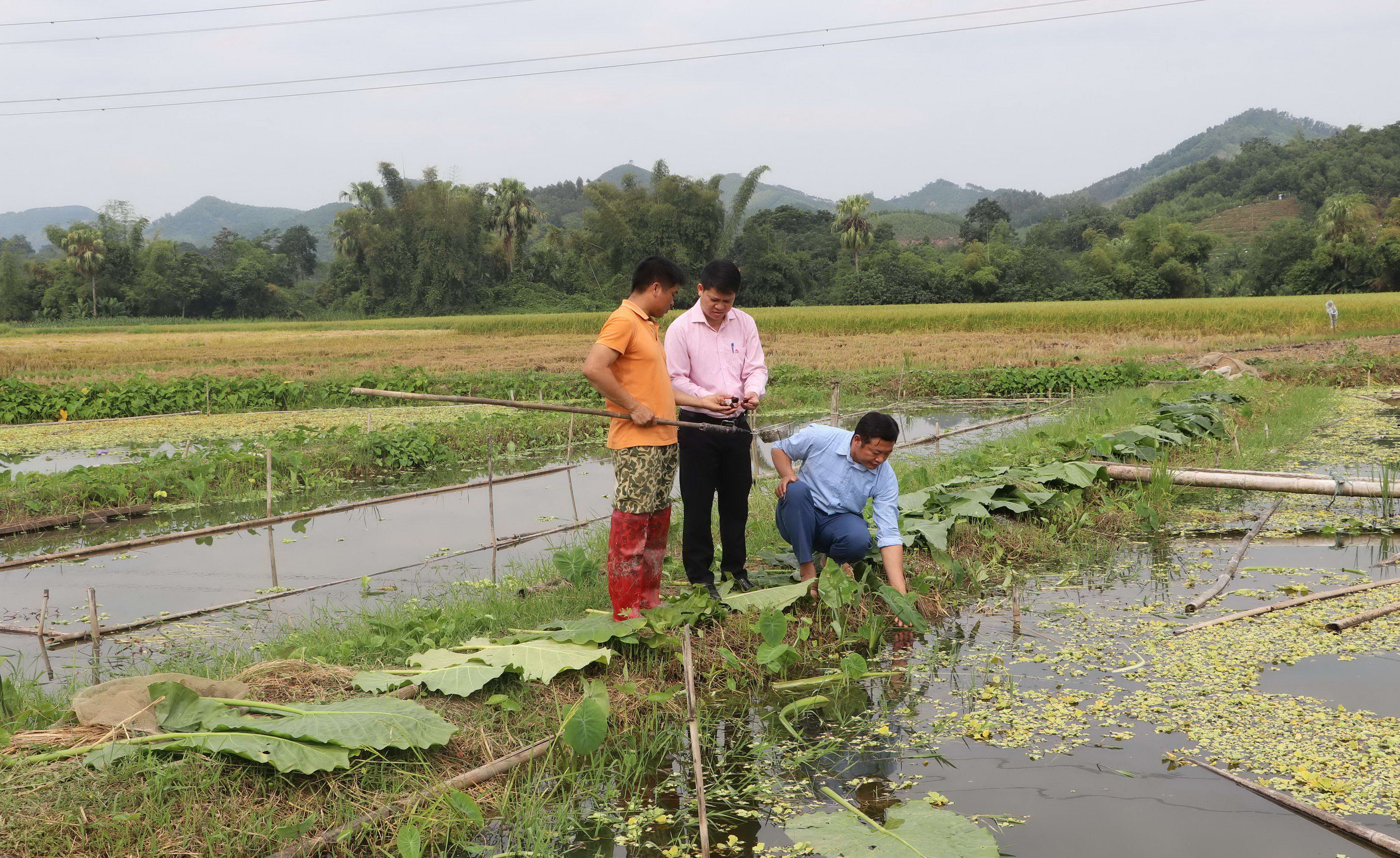 Ông Nguyễn Công Hoan (áo vàng), dân tộc Tày, xóm Đồng Phủ 1, xã Yên Trạch vay vốn 100 triệu đồng để chuyển đổi mô hình nuôi ốc