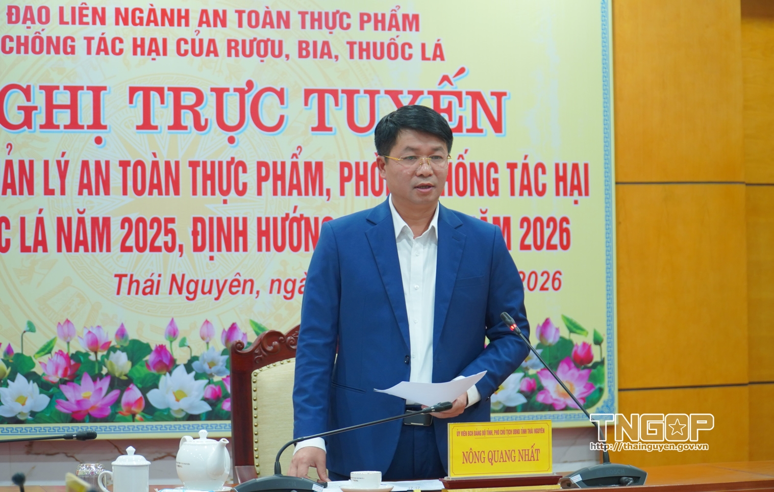 Ngày 15/1, đồng chí Nông Quang Nhất, Phó Chủ tịch UBND tỉnh, Phó Trưởng ban Thường trực Ban Chỉ đạo liên ngành an toàn thực phẩm và phòng, chống tác hại của rượu, bia, thuốc lá tỉnh chủ trì Hội nghị trực tuyến tổng kết công tác năm 2025, triển khai phương hướng, nhiệm vụ năm 2026.