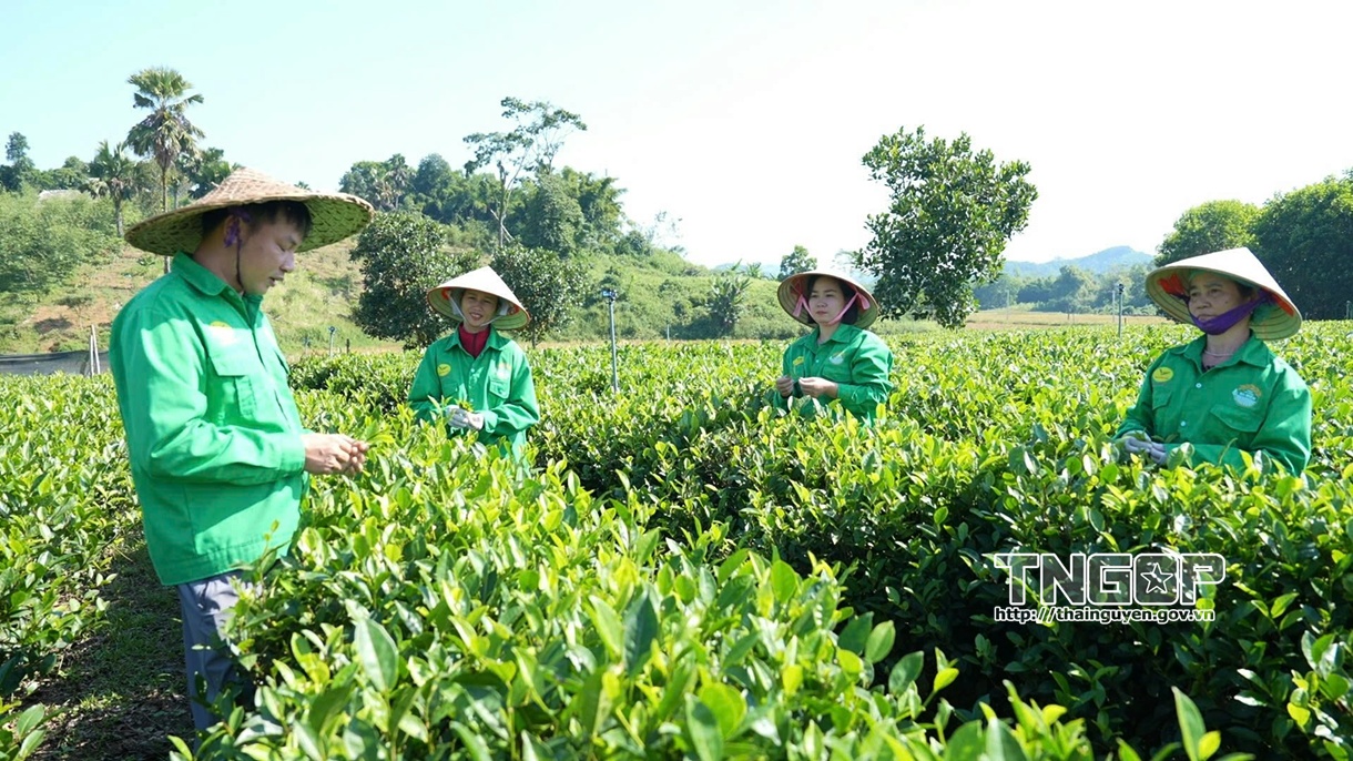 Ông Tống Văn Viện, Chủ tịch Hội đồng quản trị kiêm Giám đốc Hợp tác xã Nông sản Phú Lương trao đổi với các xã viên về chăm sóc cây chè