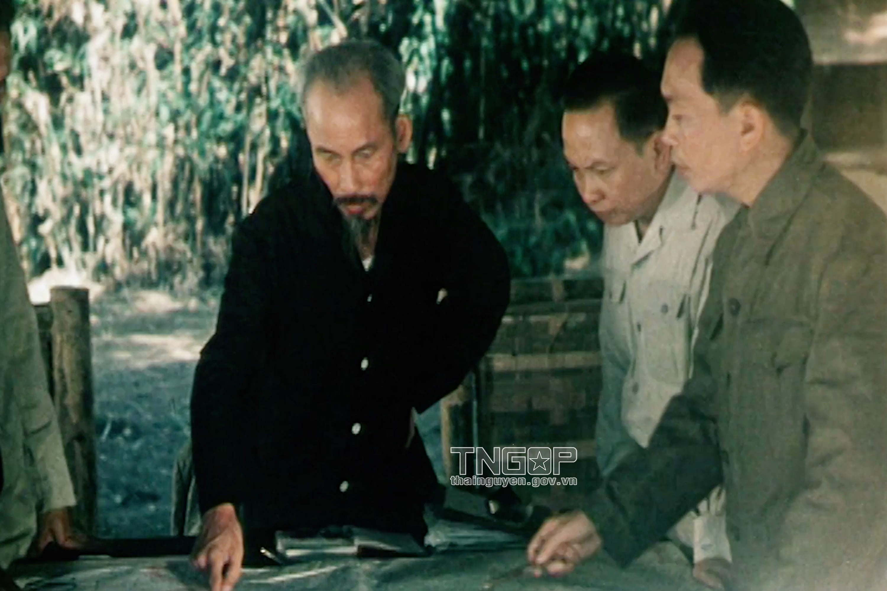 Bác Hồ và các đồng chí Ủy viên Bộ Chính trị tại Tỉn Keo, xã Phú Đình, huyện Định Hóa, Thái Nguyên. (Hình tư liệu)