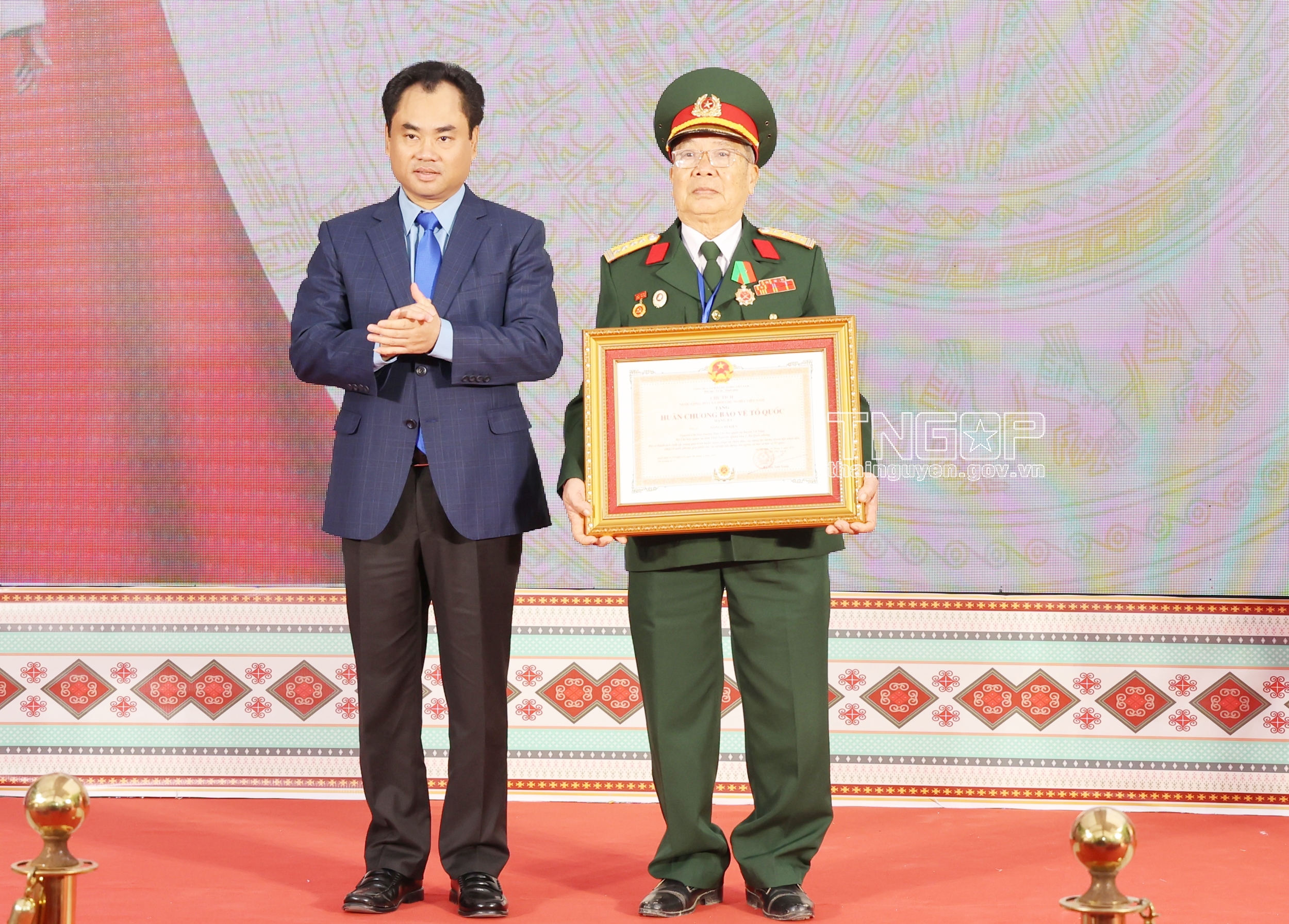 Tại buổi lễ, thừa ủy quyền của Chủ tịch nước, đồng chí Bí thư Tỉnh ủy Trịnh Việt Hùng trao Huân chương Lao động hạng Ba cho Đại tá Nông Chí Kiên, nguyên Chỉ huy trưởng Ban Chỉ huy quân sự huyện Võ Nhai
