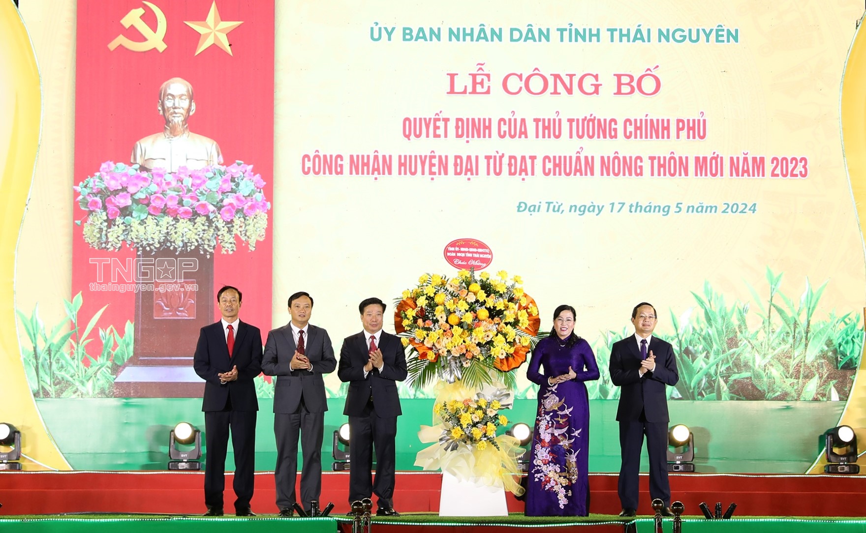 Tối 17/5, tại Quảng trường 27 - 7 (Đại Từ), UBND tỉnh tổ chức Lễ công bố Quyết định của Thủ tướng Chính phủ công nhận huyện Đại Từ đạt chuẩn nông thôn mới (NTM) năm 2023 và Khai mạc Lễ hội trà Đại Từ năm Giáp Thìn 2024. Đến dự có các đồng chí: Nguyễn Thanh Hải, Uỷ viên BCH Trung ương Đảng, Bí thư Tỉnh ủy, Trưởng Đoàn ĐBQH tỉnh; Phạm Hoàng Sơn, Phó Bí thư Thường trực Tỉnh ủy, Chủ tịch HĐND tỉnh; Ngô Trường Sơn, Chánh Văn phòng điều phối NTM Trung ương; các đồng chí Uỷ viên Ban thường vụ Tỉnh uỷ; lãnh HĐND - UBND - Ủy ban MTTQ; lãnh đạo các sở, ban, ngành, đoàn thể của tỉnh; các huyện, thành phố…