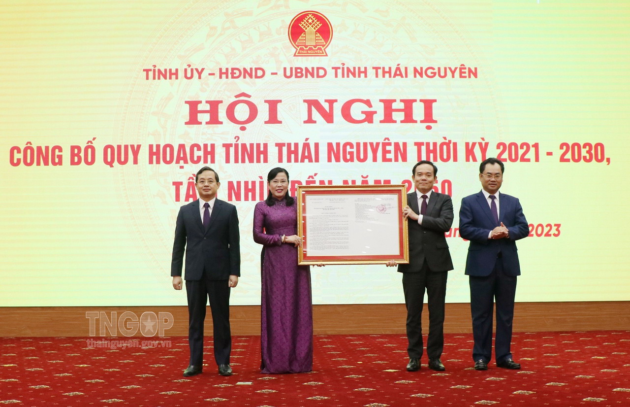 Phó Thủ tướng Chính phủ Trần Lưu Quang trao Quyết định số 222/QĐ-TTg ngày 14/3/2022 của Thủ tướng Chính phủ về việc phê duyệt Quy hoạch tỉnh Thái Nguyên thời kỳ 2021 - 2030, tầm nhìn đến năm 2050 cho lãnh đạo tỉnh Thái Nguyên. (Ảnh chụp ngày 15/4/2023)
