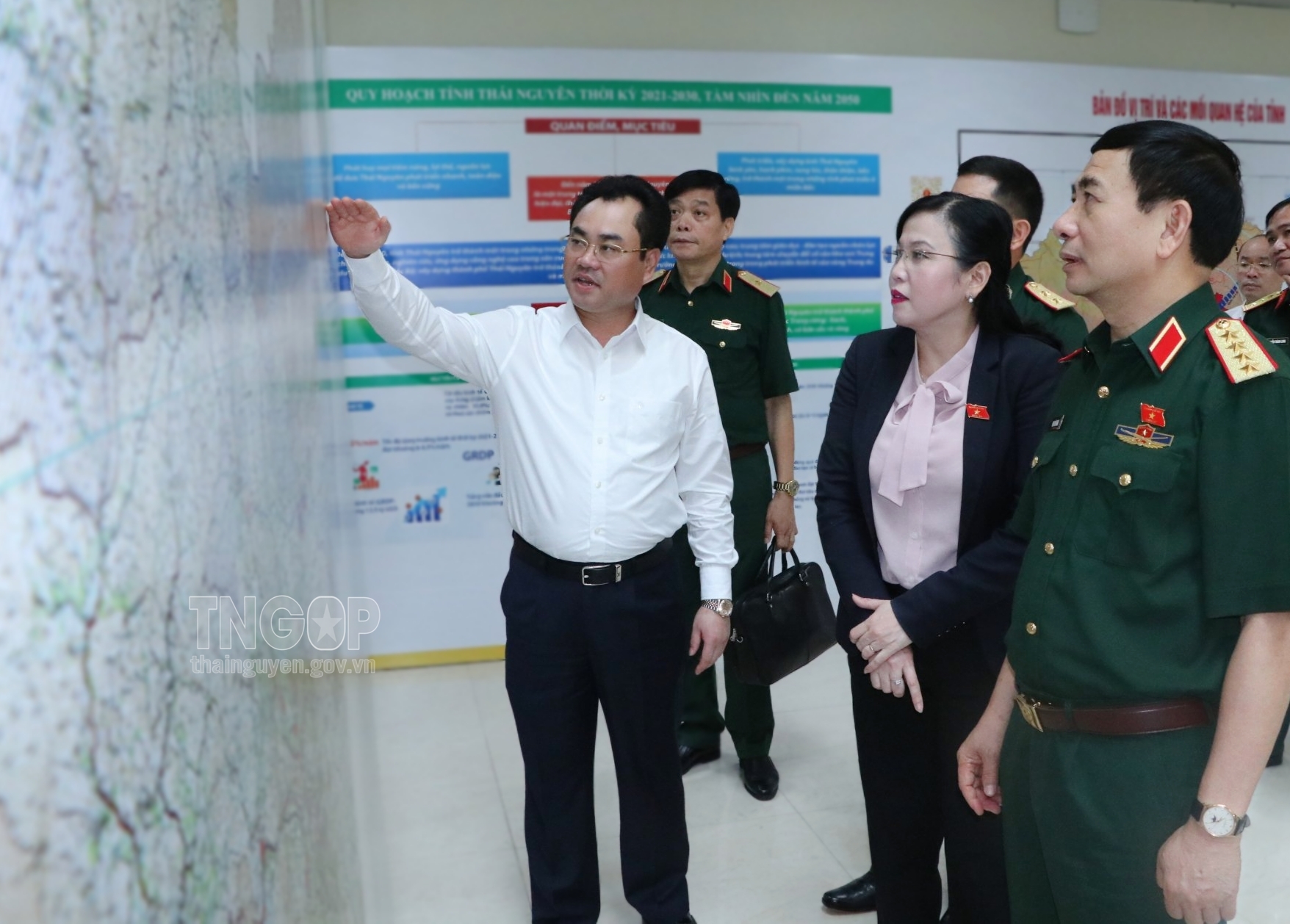 Đồng chí Trịnh Việt Hùng, Ủy viên dự khuyết BCH Trung ương Đảng, Phó Bí thư Tỉnh ủy, Chủ tịch UBND tỉnh giới thiệu Quy hoạch tỉnh Thái Nguyên với Bộ trưởng Bộ Quốc phòng Phan Văn Giang và Đoàn công tác của Bộ Quốc phòng