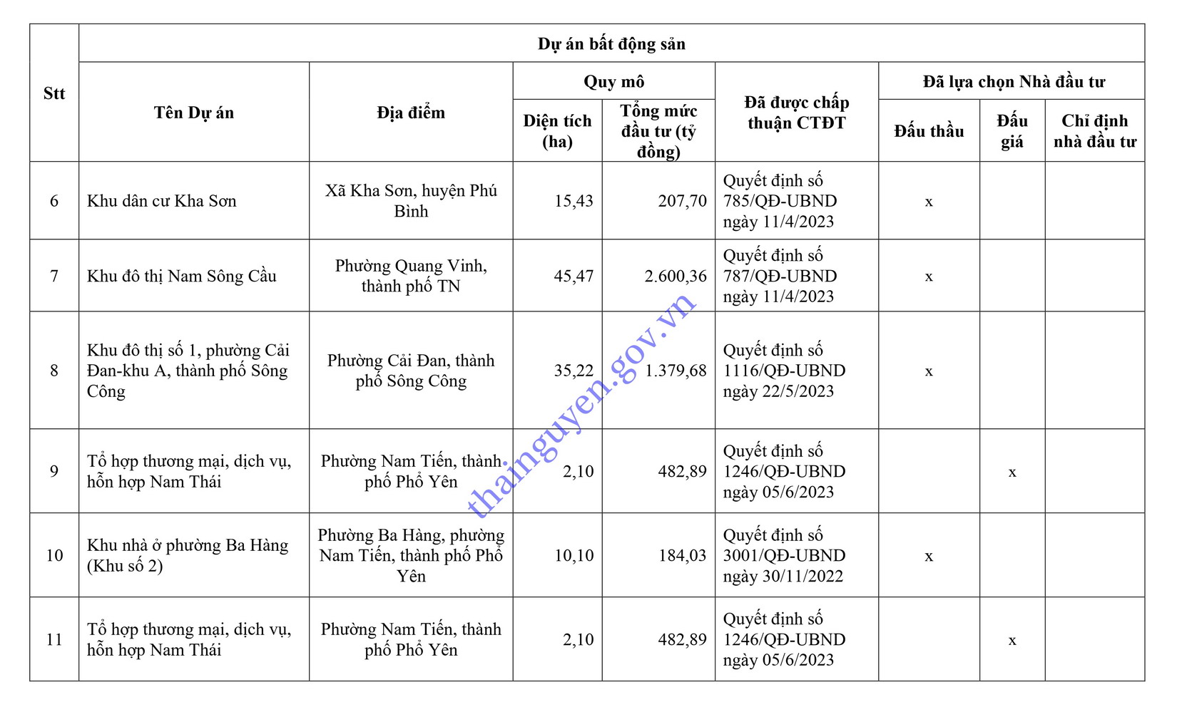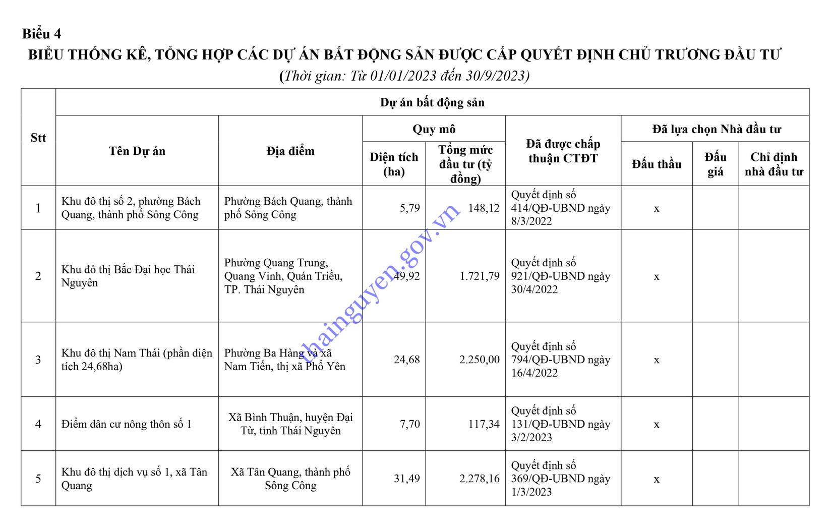 Sở Xây dựng công bố các dự án bất động sản được cấp Quyết định chấp thuận chủ trương đầu tư trong năm 2023 cập nhật đến ngày 30/9/2023 (Biểu 4).