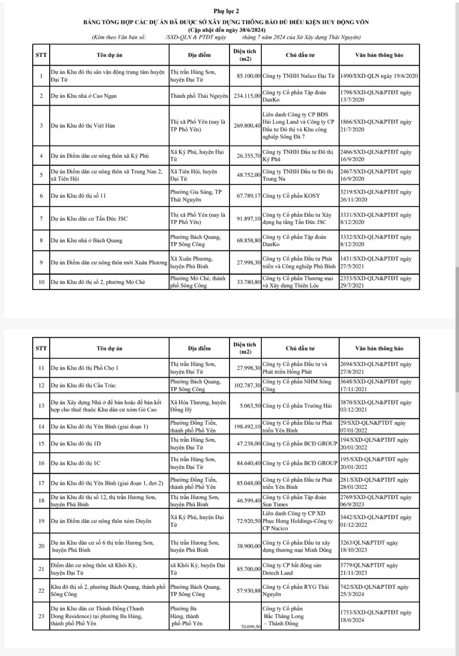 Sở Xây dựng công bố Danh sách các dự án đủ điều kiện huy động vốn để hợp tác đầu tư, hợp tác kinh doanh, liên doanh liên kết thực hiện dự án cập nhật đến ngày 30/6/2024 (Phụ lục 2).