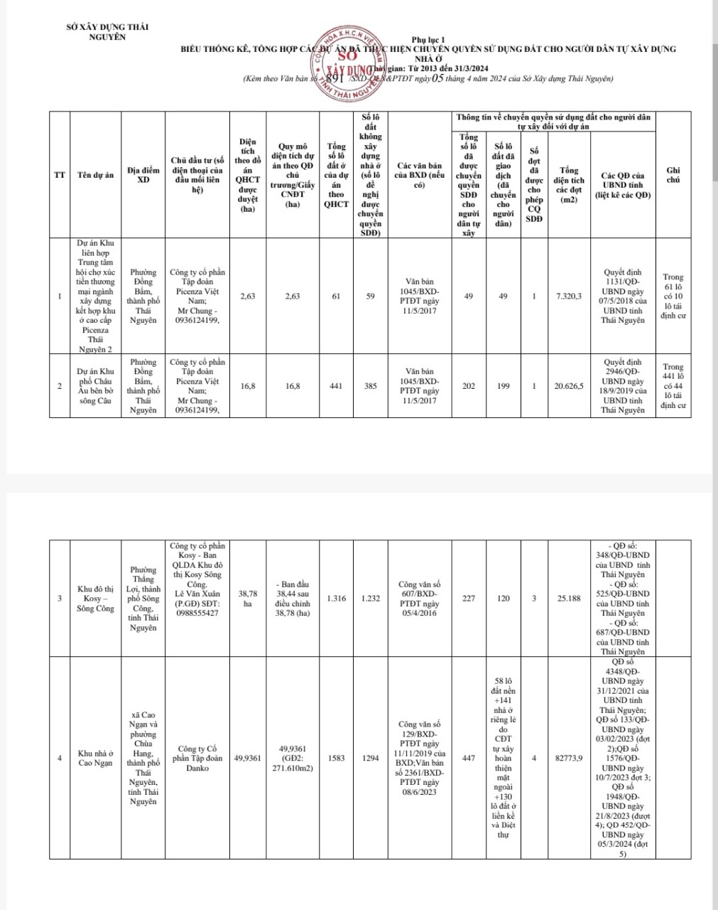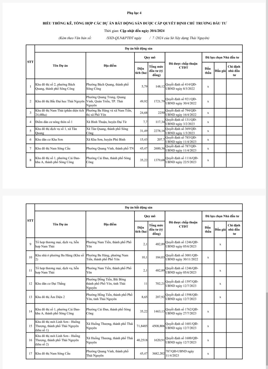 Sở Xây dựng công bố tổng số các dự án bất động sản được cấp Quyết định chấp thuận chủ trương đầu tư cập nhật đến ngày 30/6/2024 (Phụ lục 04).