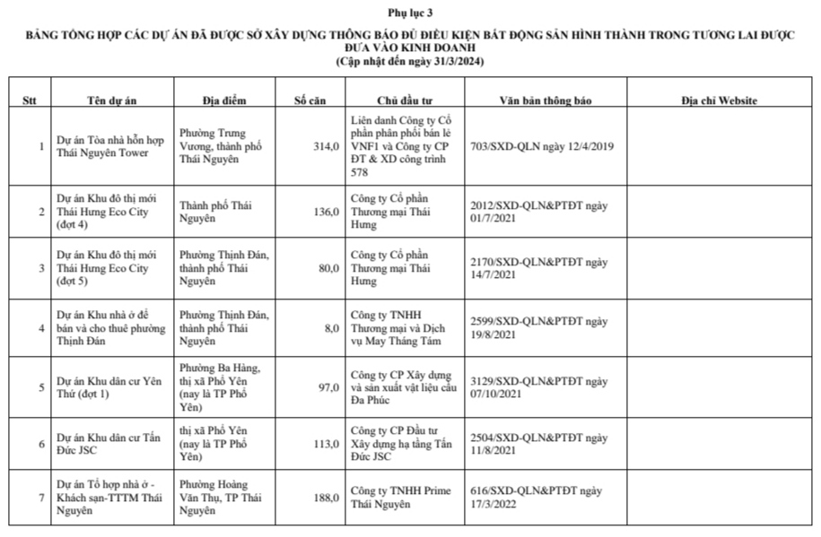Sở Xây dựng công bố Danh sách các dự án đủ điều kiện bất động sản hình thành trong tương lai đưa vào kinh doanh cập nhật đến ngày 30/6/2024 (Phụ lục 03).