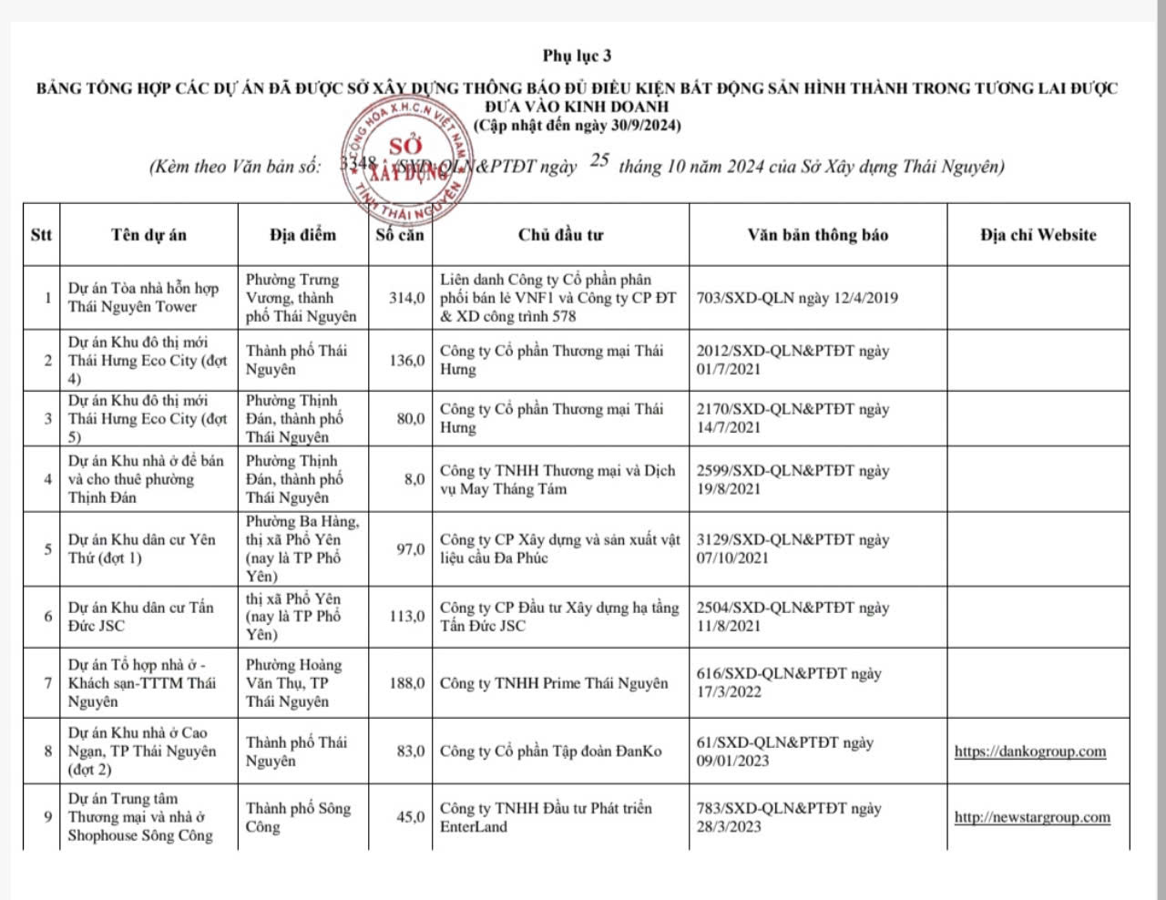 Sở Xây dựng công bố Danh sách các dự án đủ điều kiện bất động sản hình thành trong tương lai đưa vào kinh doanh cập nhật đến ngày 30/9/2024 (Phụ lục 03).