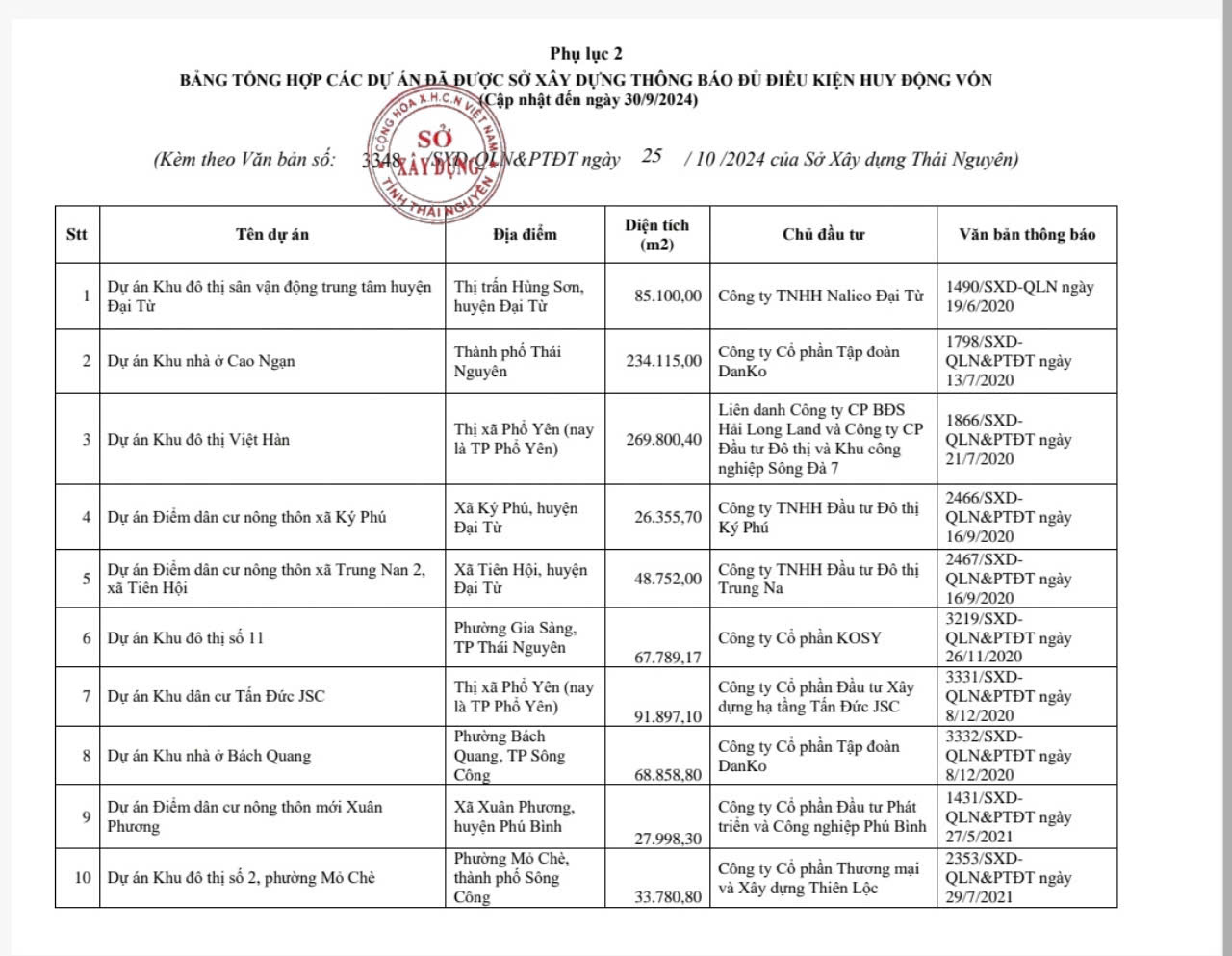 Sở Xây dựng công bố Danh sách các dự án đủ điều kiện huy động vốn để hợp tác đầu tư, hợp tác kinh doanh, liên doanh liên kết thực hiện dự án cập nhật đến ngày 30/9/2024 (Phụ lục 2).