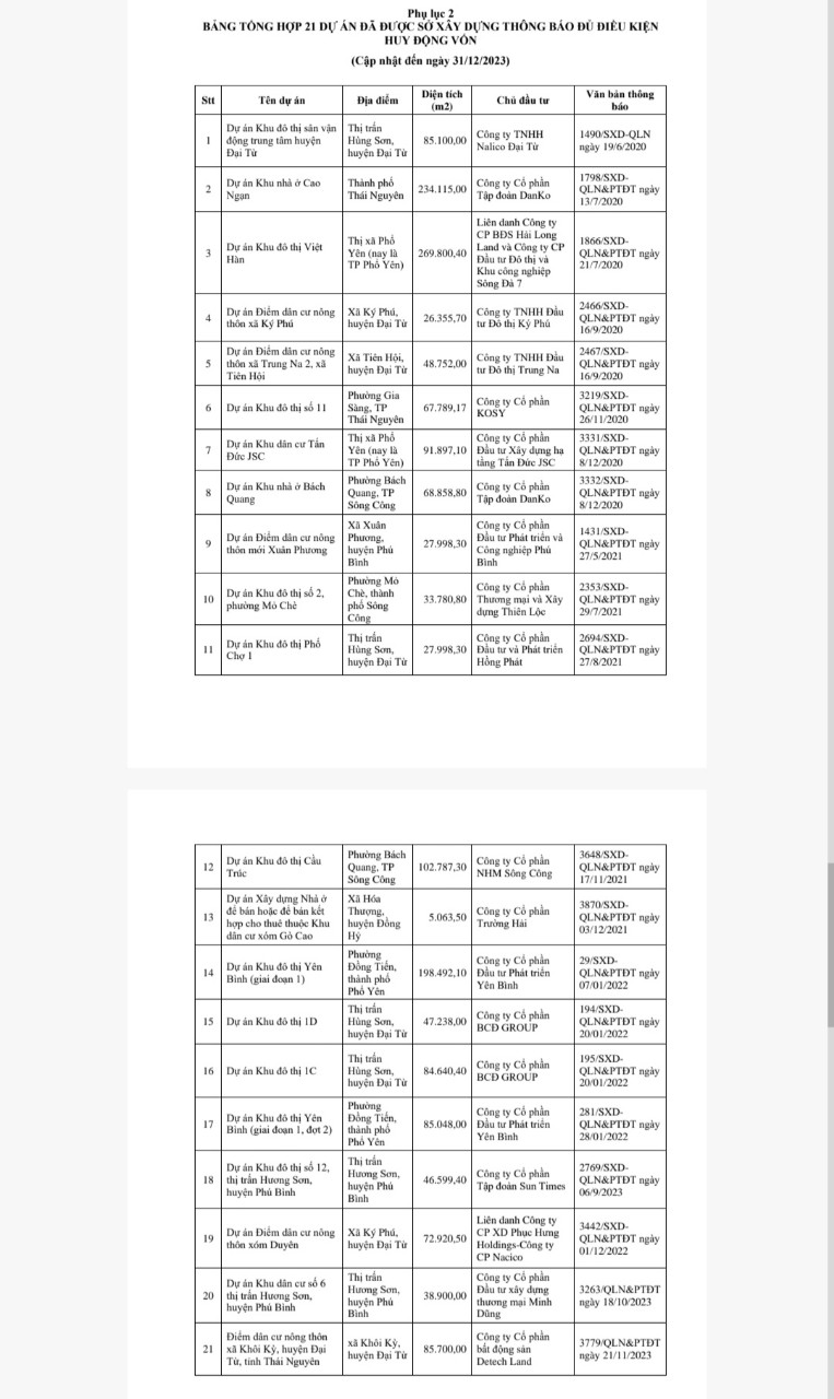Sở Xây dựng công bố Danh sách các dự án đủ điều kiện huy động vốn để hợp tác đầu tư, hợp tác kinh doanh, liên doanh liên kết thực hiện dự án cập nhật đến ngày 31/12/2023 (Phụ biểu 2).