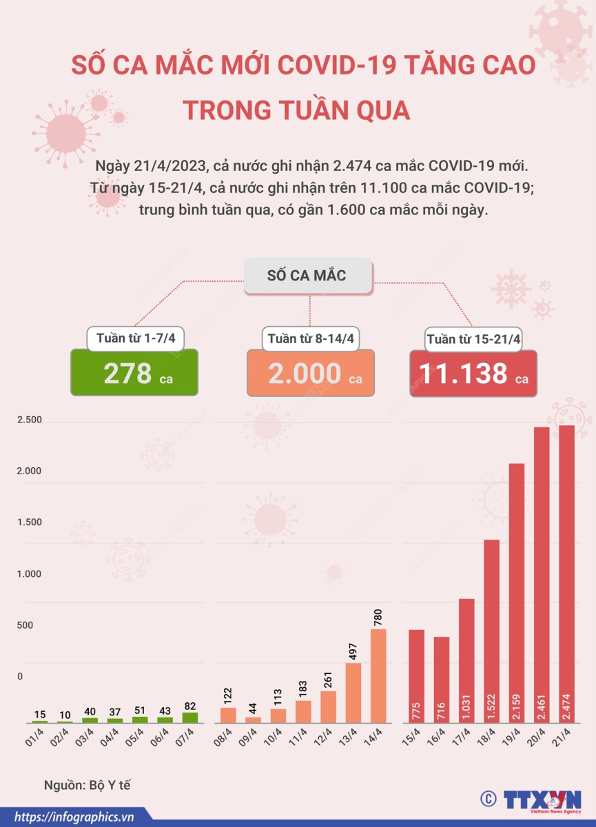 Ngày 21/4/2023, cả nước ghi nhận 2.474 ca mắc COVID-19 mới. Như vậy từ ngày 15-21/4, cả nước ghi nhận trên 11.100 ca mắc COVID-19 trung bình tuần qua, mỗi ngày có gần 1.600 ca mắc.