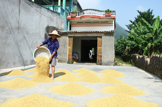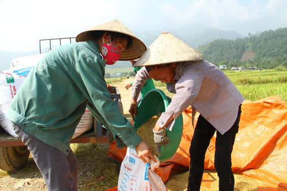 Nhờ tích cực áp dụng khoa học kỹ thuật vào đồng ruộng, nông dân trong xã liên tục có những vụ mùa bội thu. Ảnh: Thu hoạch lúa mùa tại xóm Chuối, xã Ký Phú.