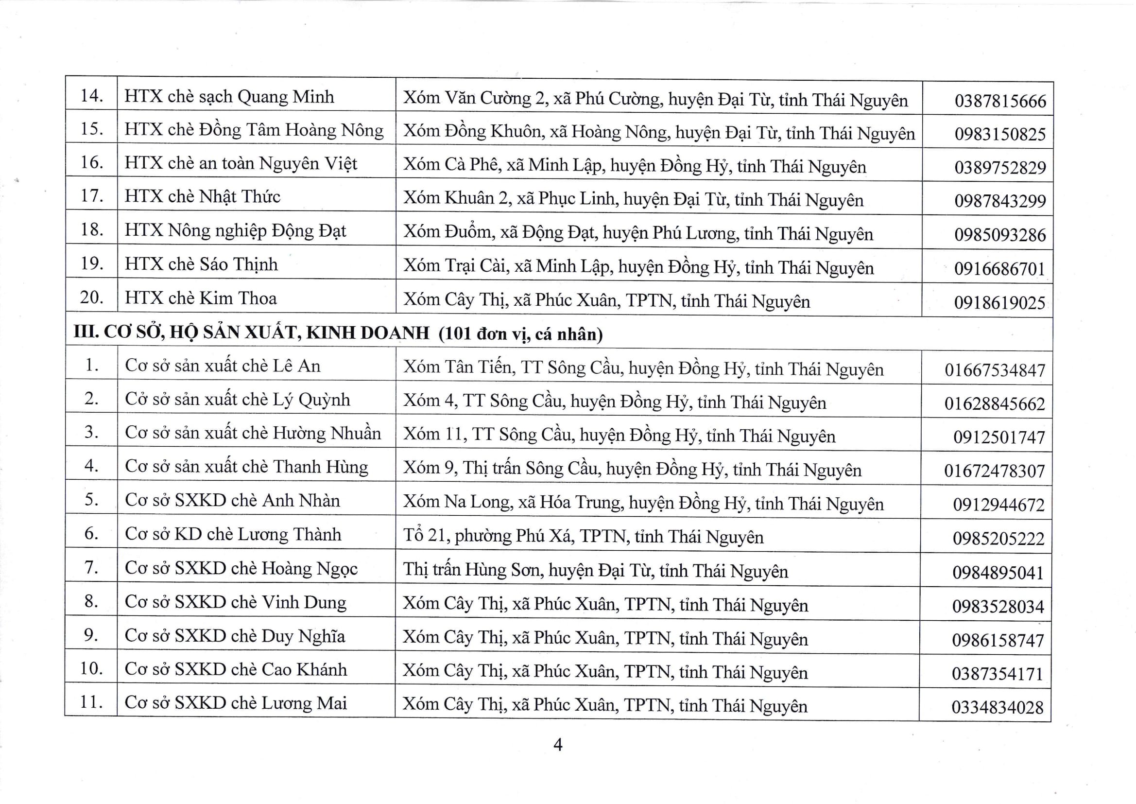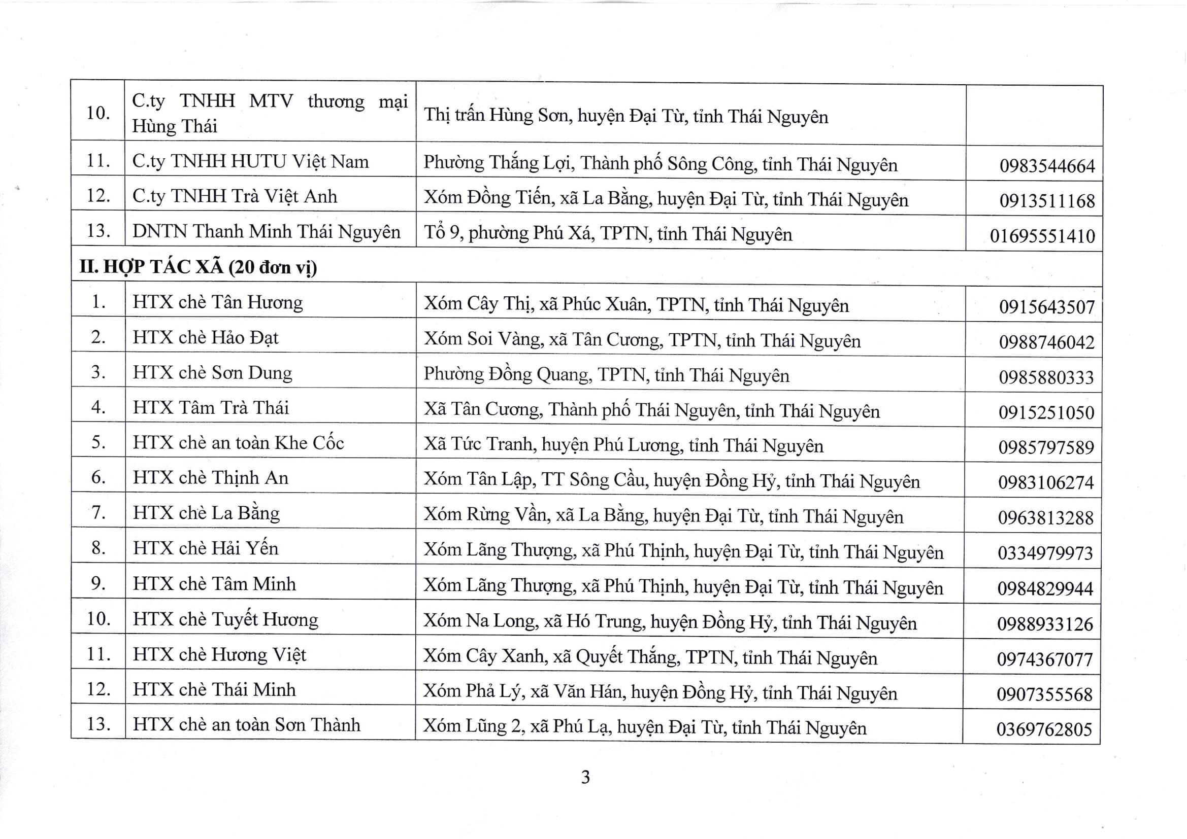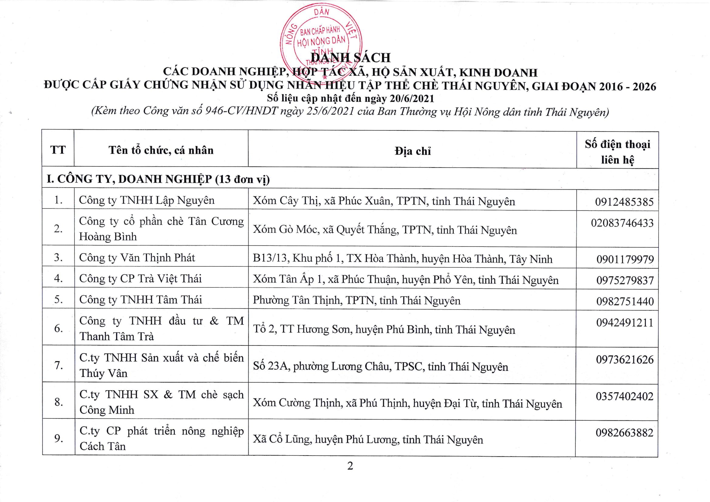 Danh sách các đơn vị, doanh nghiệp, hợp tác xã, hộ sản xuất, kinh doanh đăng ký sử dụng Nhãn hiệu tập thể “Chè Thái Nguyên”, giai đoạn 2016 – 2026