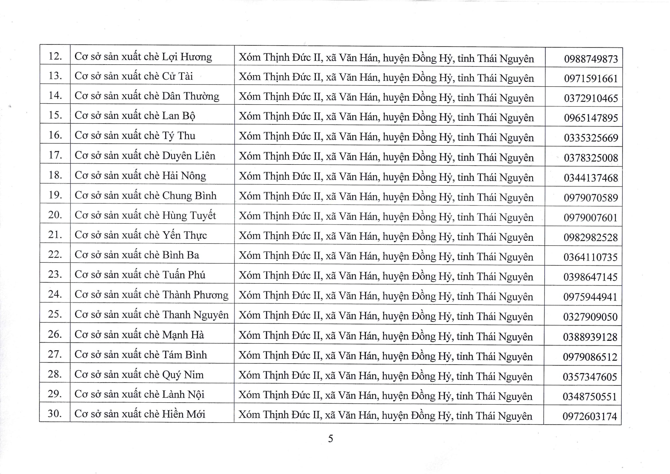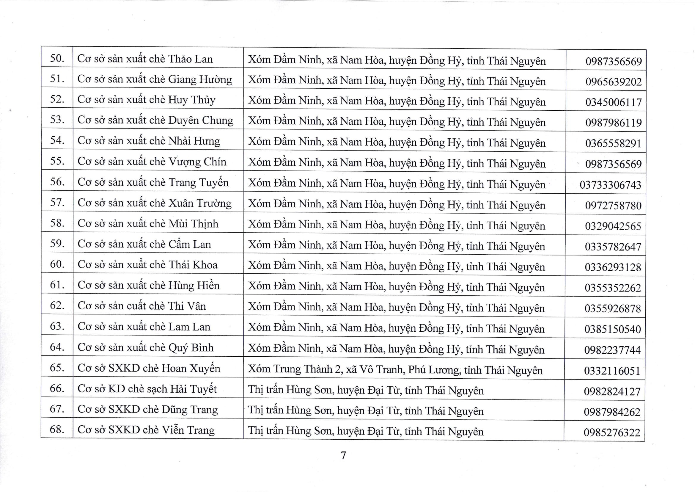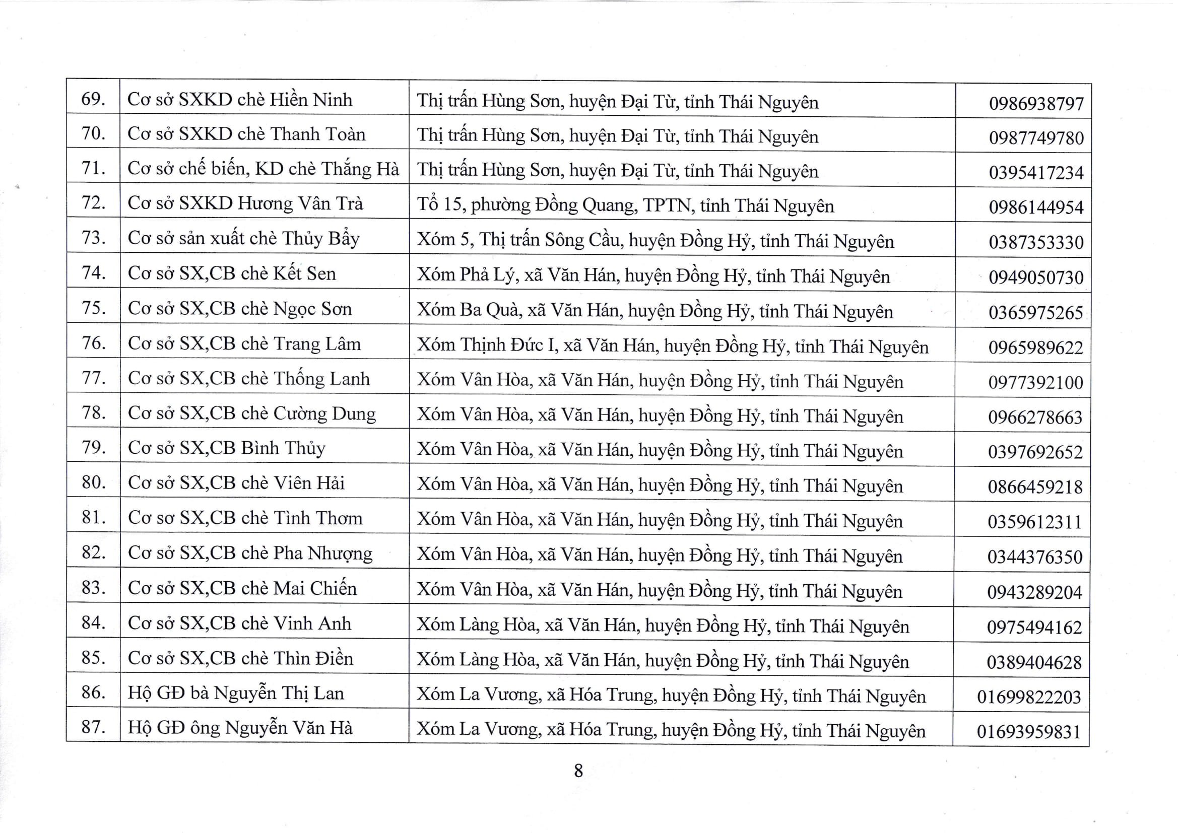 Danh sách các đơn vị, doanh nghiệp, hợp tác xã, hộ sản xuất, kinh doanh đăng ký sử dụng Nhãn hiệu tập thể “Chè Thái Nguyên”, giai đoạn 2016 – 2026