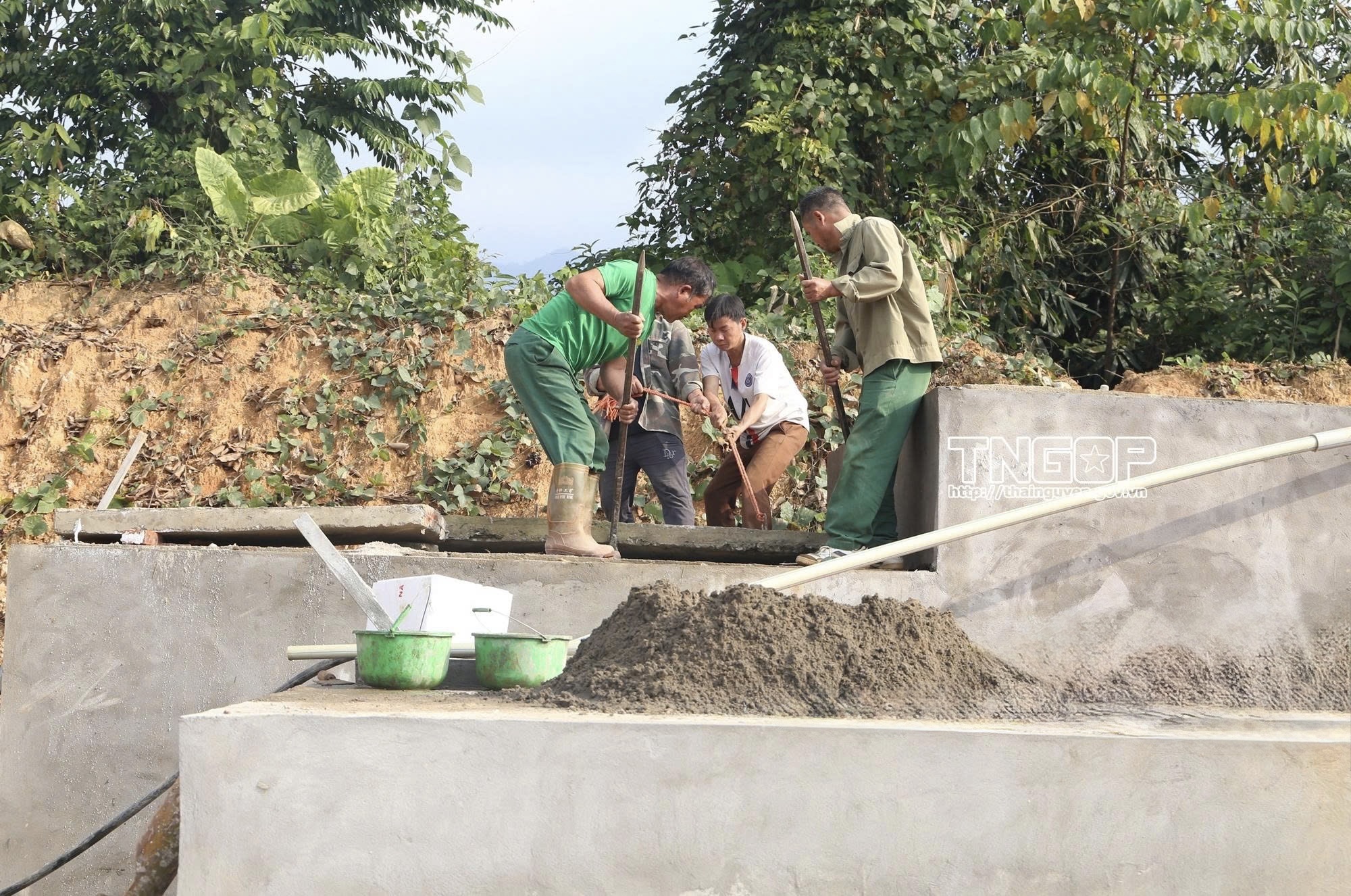 Hệ thống cấp nước sinh hoạt bao gồm các hạng mục công trình: Cửa thu, bể điều hòa, bể lọc, đường ống dẫn nước, hố van và trụ vòi. (Trong ảnh: Công nhân hoàn thiện hệ thống bể điều hòa, bể lọc nước)