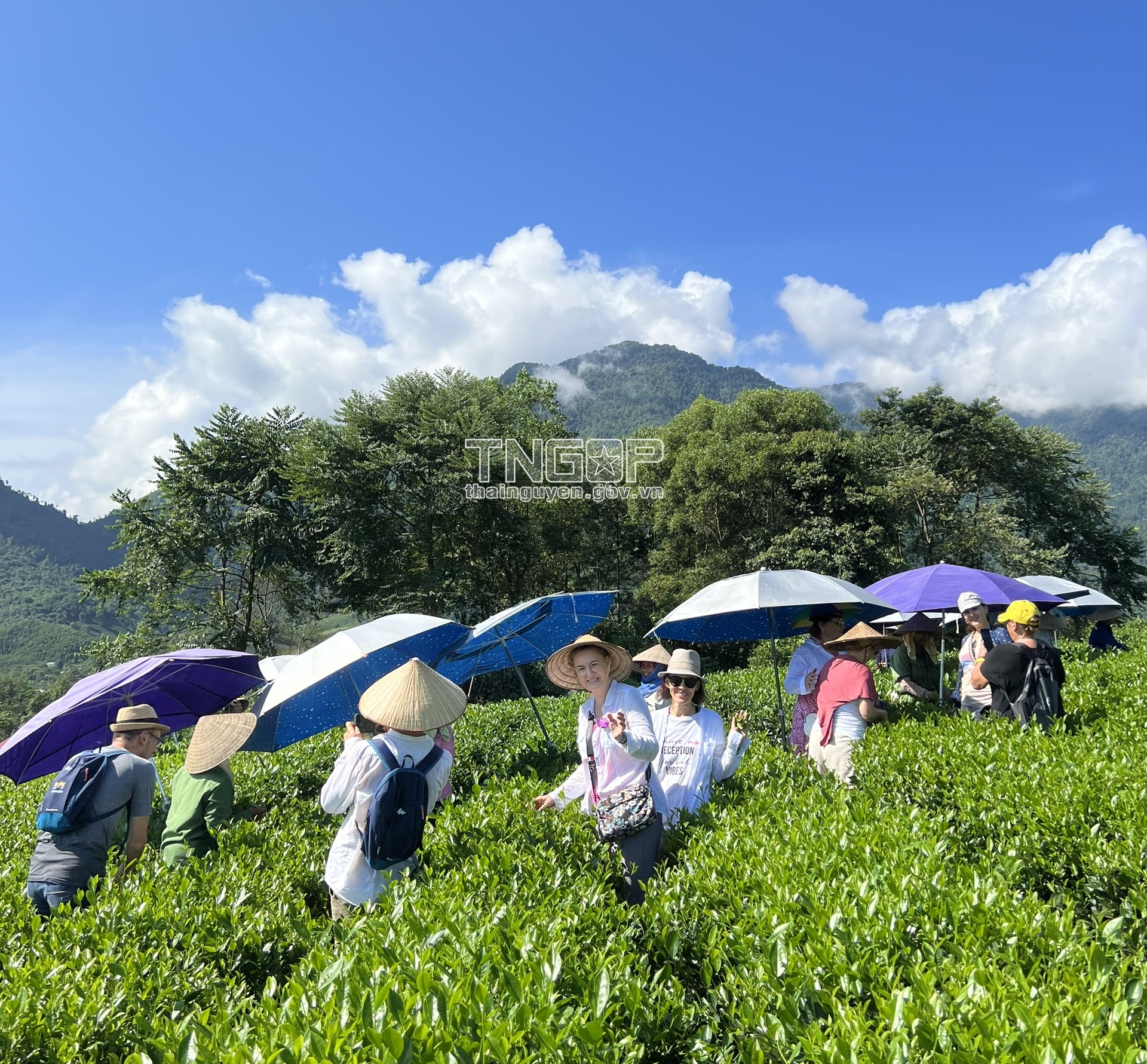 Du khách trải nghiệm hái chè và chụp ảnh lưu niệm