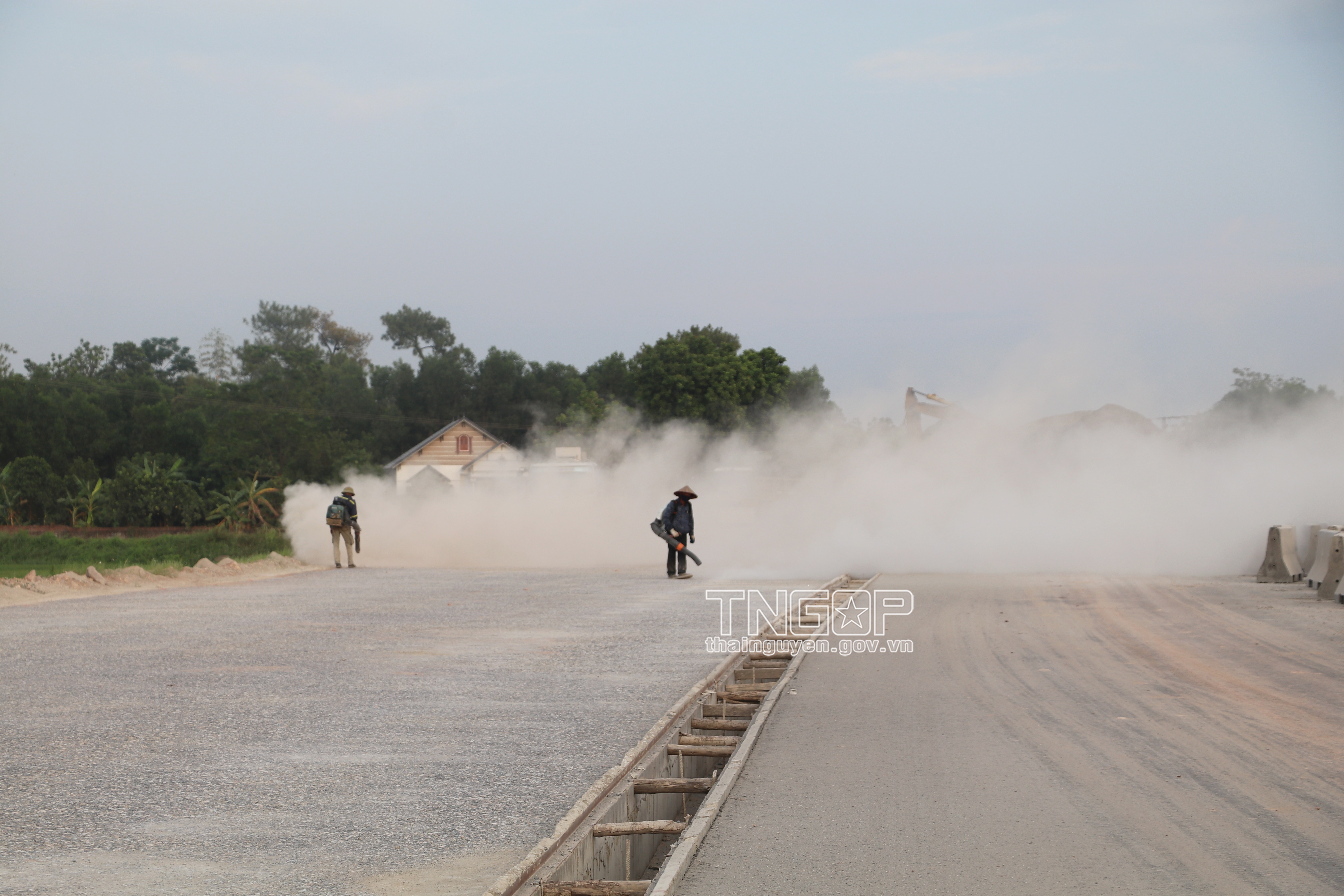 Công nhân vệ sinh mặt đường trước khi thi công láng nhựa tại Km0+00 - Km1+00, cầu Kênh Trôi thuộc Dự án đường Vành đai V