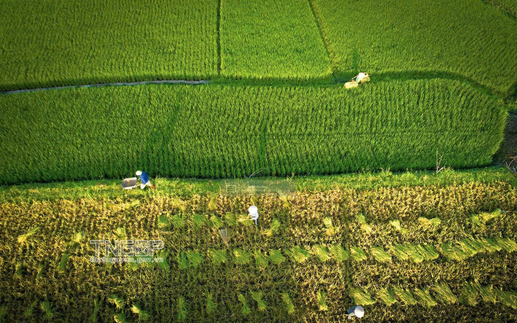 Bộ ảnh “Mùa vàng trên quê hương Thái Nguyên” là một bản giao hưởng hình ảnh sống động, khắc họa vùng đất bán sơn địa yên bình và trù phú. Qua từng khung hình, người xem như được đồng hành trên hành trình vất vả mà chan chứa yêu thương, từ những ngày lúa xanh mướt, mơn mởn sức sống đến khi đồng vàng rực rỡ, lúa trĩu hạt và tiếng máy gặt vang vọng khắp cánh đồng. Dù là bằng đôi tay thủ công hay nhịp nhàng cơ giới hóa, mùa gặt vẫn luôn là thời khắc thiêng liêng, nơi nụ cười người nông dân rạng rỡ và chân thực nhất.