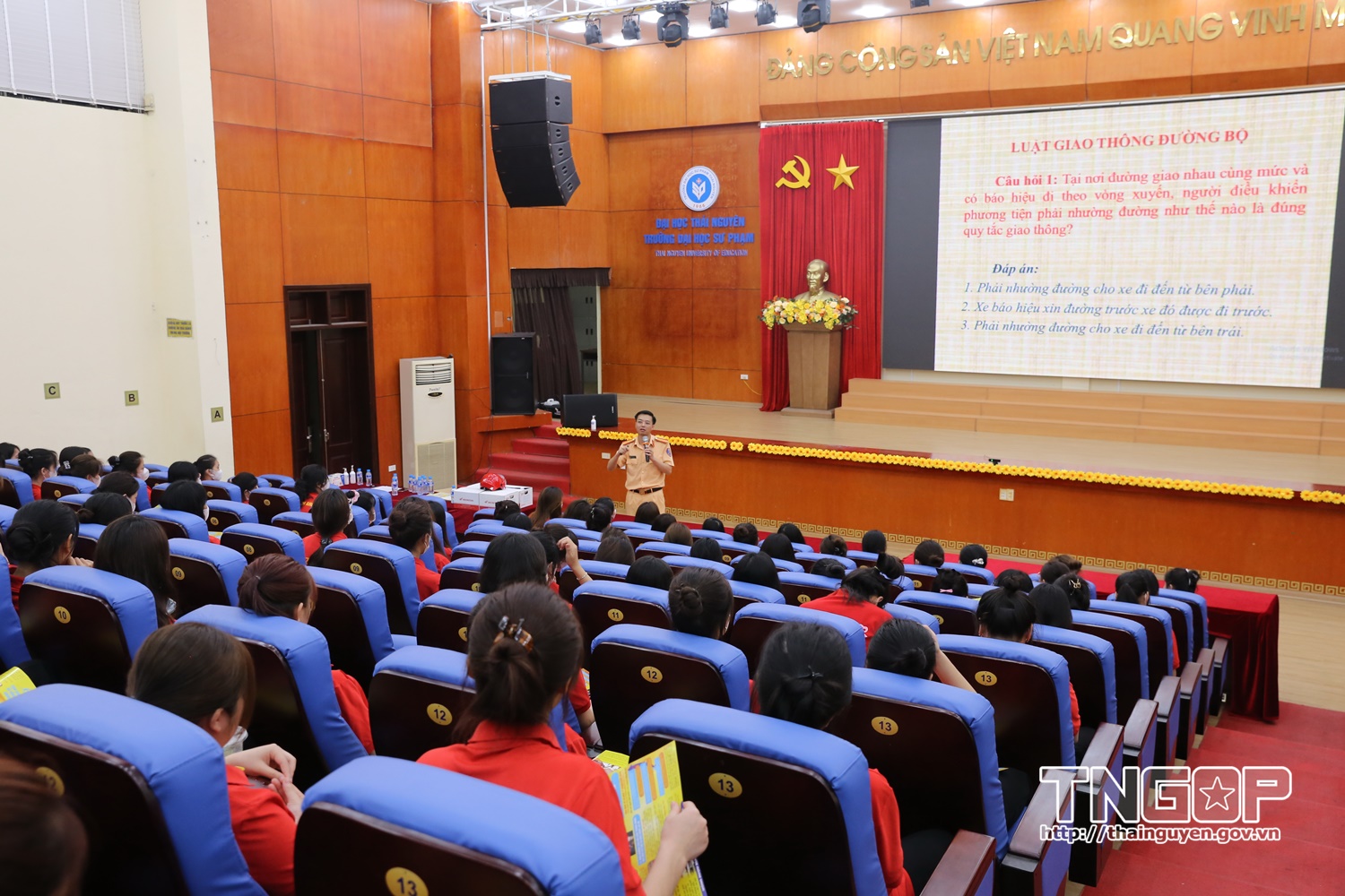 Cán bộ Phòng Cảnh sát giao thông tuyên truyền pháp luật về TTATGT cho sinh viên Trường Đại học Sư phạm - Đại học Thái Nguyên
