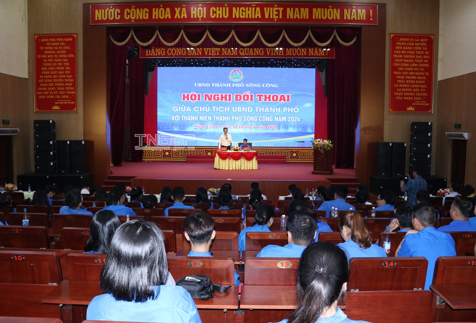 Sáng 12/5, UBND TP. Sông Công tổ chức Hội nghị đối thoại giữa Chủ tịch UBND thành phố với thanh niên TP. Sông Công. Dự Hội nghị có lãnh đạo các phòng, ban chuyên môn của TP. Sông Công và đông đảo thanh niên trên địa bàn.