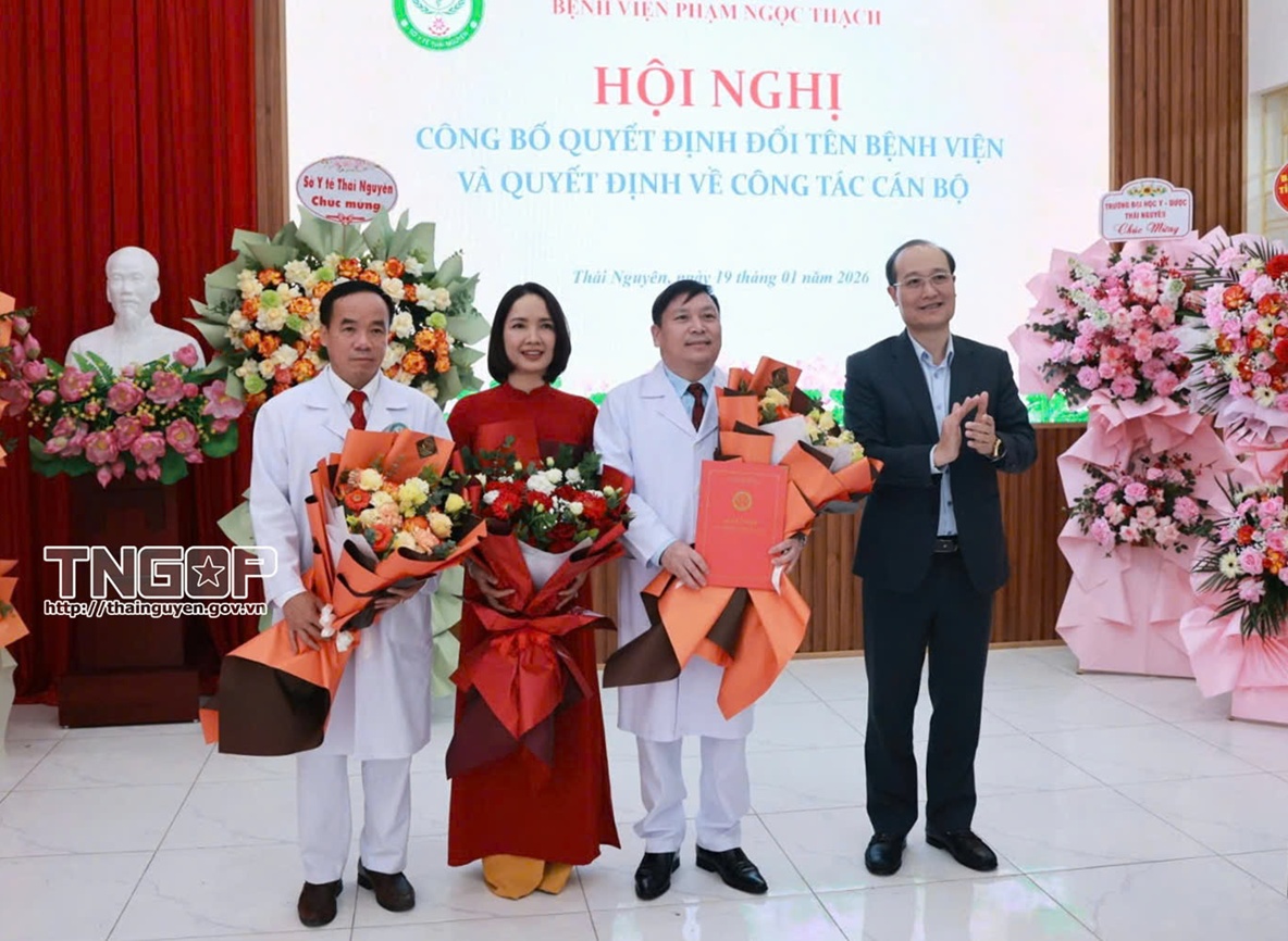 Tại Hội nghị, đại diện Sở Y tế đã công bố Quyết định số 2662/QĐ-UBND ngày 31/12/2025 của UBND tỉnh Thái Nguyên về việc tổ chức lại và đổi tên Trung tâm Y tế Thái Nguyên thành Bệnh viện Phạm Ngọc Thạch thuộc Sở Y tế tỉnh Thái Nguyên. Đồng thời, công bố các quyết định của Sở Y tế về công tác cán bộ. Theo đó, đồng chí Hà Đức Trịnh, Giám đốc Trung tâm Y tế Thái Nguyên được bổ nhiệm giữ chức Giám đốc Bệnh viện Phạm Ngọc Thạch; các Phó Giám đốc Bệnh viện cũng được kiện toàn theo quy định.