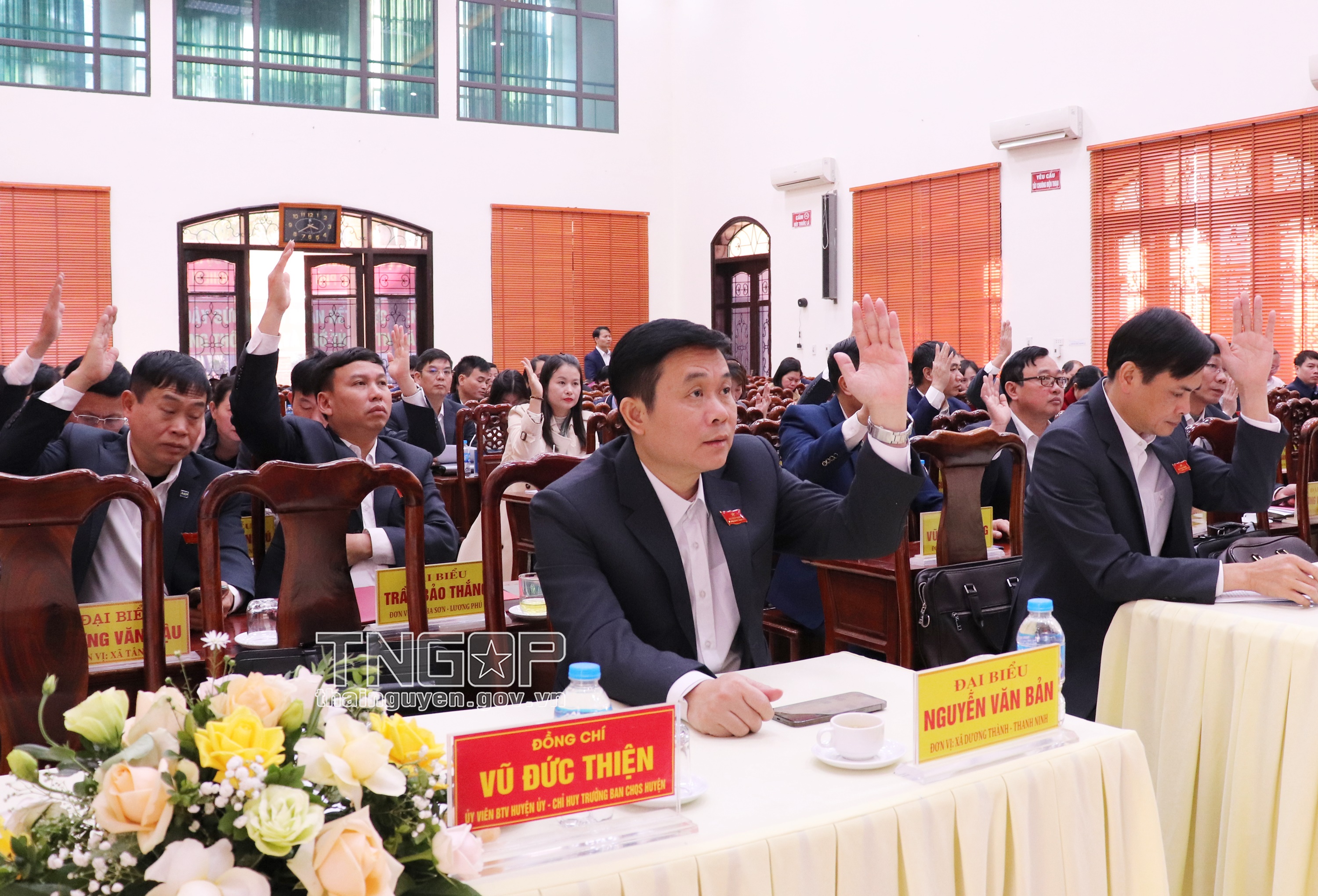 Các đại biểu HĐND huyện biểu quyết thông qua dự thảo nghị quyết