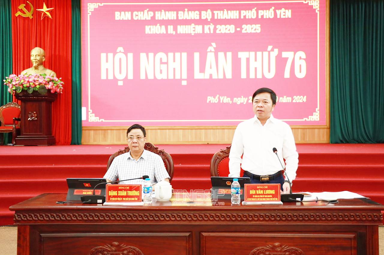 Sáng nay (26/9), Ban Chấp hành Đảng bộ thành phố Phổ Yên tổ chức Hội nghị lần thứ 76. Dự và chủ trì Hội nghị có các đồng chí: Đặng Xuân Trường, Ủy viên Ban Thường vụ Tỉnh ủy, Phó Chủ tịch Thường trực UBND tỉnh; Bùi Văn Lương, Ủy viên Ban Thường vụ Tỉnh ủy, Bí thư Thành ủy, Chủ tịch HĐND TP. Phổ Yên.
