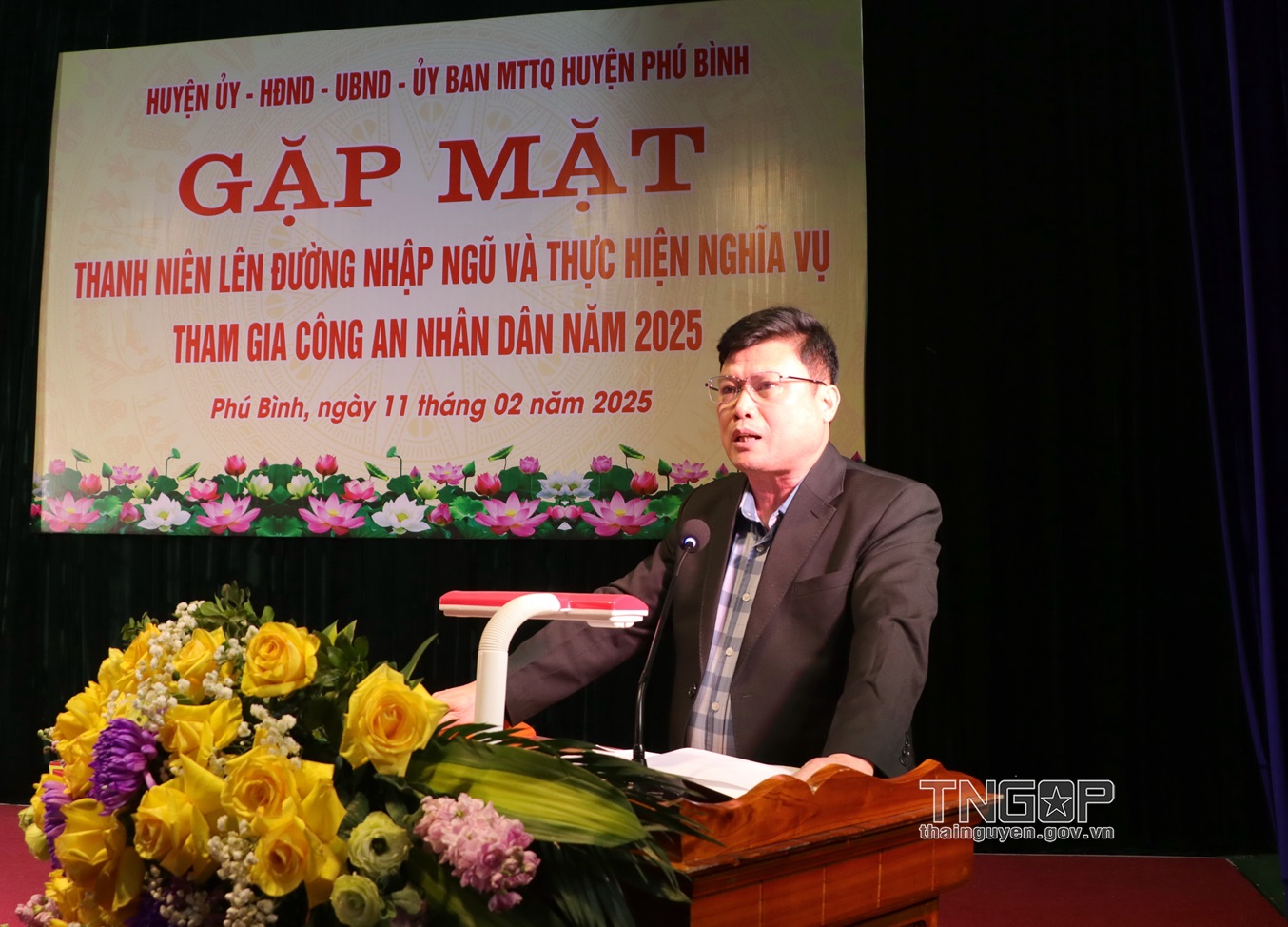 Phát biểu tại chương trình Gặp mặt, lãnh đạo huyện Phú Bình đã biểu dương ý thức, trách nhiệm với Tổ quốc và tinh thần hăng hái lên đường nhập ngũ của các thanh niên, trong đó có nhiều thanh niên viết đơn tình nguyện nhập ngũ. Với vinh dự và tự hào được làm người chiến sĩ Quân đội nhân dân và Công an nhân dân Việt Nam, lãnh đạo huyện Phú Bình mong muốn, tin tưởng các thanh niên dù trong bất kỳ điều kiện, hoàn cảnh nào cũng phải đoàn kết, vững vàng, khắc phục khó khăn, phấn đấu rèn luyện, vươn lên, hoàn thành xuất sắc nhiệm vụ được giao, trở thành người chiến sĩ ưu tú, xứng đáng là người kế tục sự nghiệp của cha anh, góp phần vào công cuộc xây dựng và bảo vệ Tổ quốc. Cùng với đó, lãnh đạo huyện Phú Bình đề nghị các địa phương trong huyện, dành sự quan tâm đặc biệt đối với các gia đình có con em lên đường nhập ngũ để các tân binh yên tâm cống hiến, rèn luyện tại đơn vị.