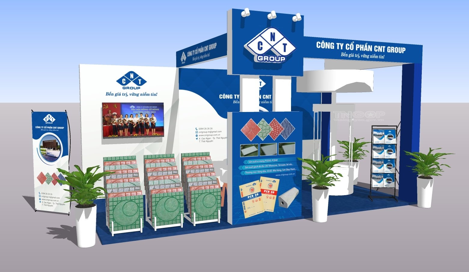 Với vị thế là doanh nghiệp sản xuất kinh doanh vật liệu xây dựng hàng đầu trong tỉnh Thái Nguyên, tại Hội chợ triển lãm lần này, CNT Group mong muốn giới thiệu tới khách hàng những sản phẩm và dịch vụ chủ lực, bao gồm: Xi măng Cao Ngạn PCB30, PCB40, gạch CNT Rehecore, Gạch terazo, bó vỉa…