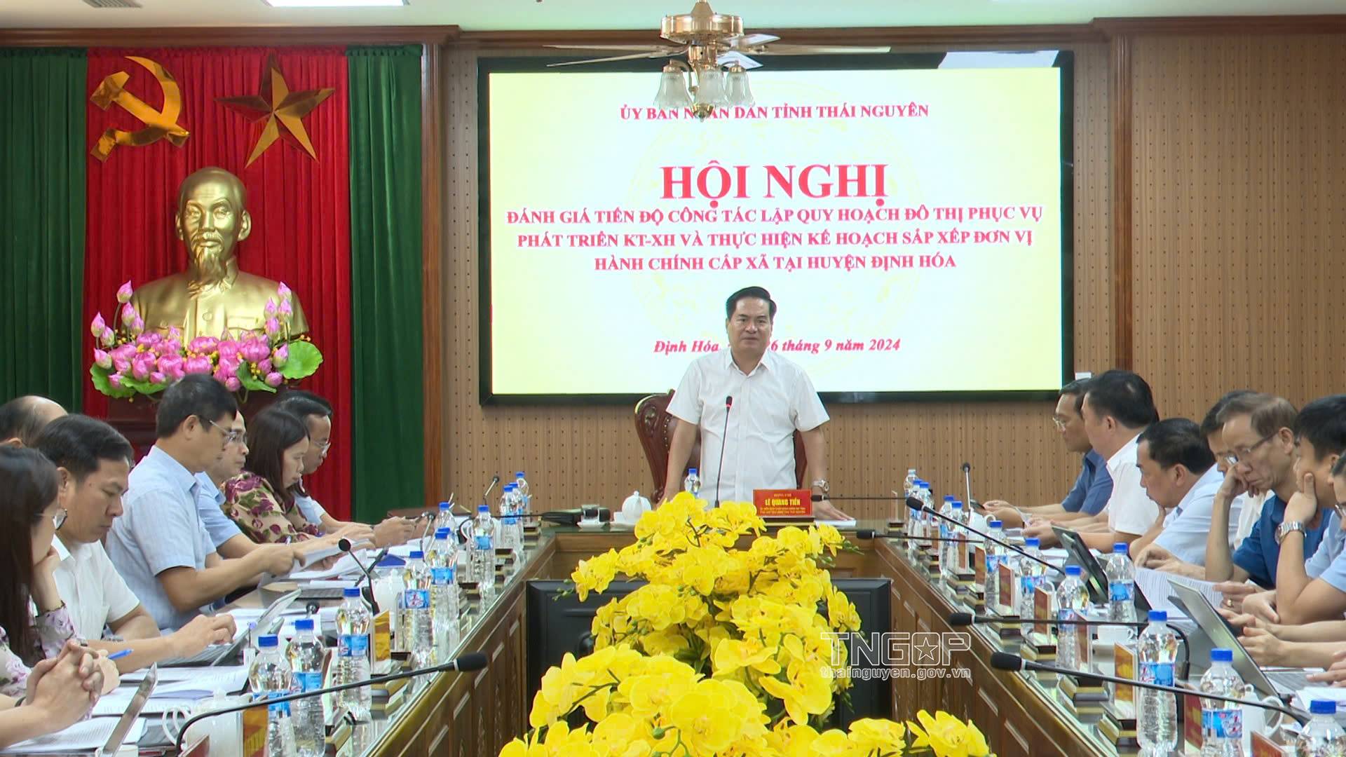 Ngày 26/9, tại huyện Định Hóa, đồng chí Lê Quang Tiến, Phó Chủ tịch UBND tỉnh chủ trì Hội nghị đánh giá tiến độ lập quy hoạch đô thị, phục vụ phát triển kinh tế - xã hội và thực hiện kế hoạch sắp xếp đơn vị hành chính cấp xã tại huyện Định Hóa. Tham dự Hội nghị có lãnh đạo các sở, ngành, đơn vị của tỉnh; đơn vị tư vấn đồ án Điều chỉnh quy hoạch chung thị trấn Chợ Chu, huyện Định Hóa đến năm 2040.