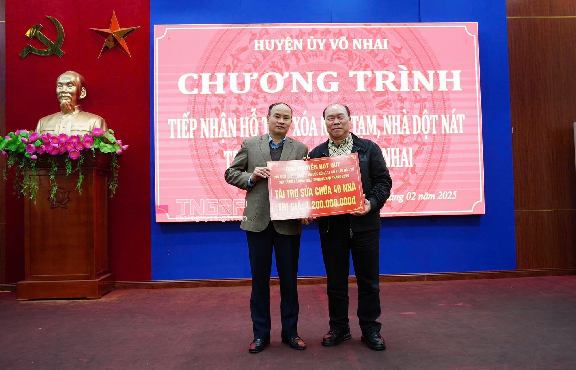 Tại Chương trình, đồng chí Lê Quang Tiến, Phó Chủ tịch UBND tỉnh gửi lời cảm ơn sâu sắc nhất tới cộng đồng doanh nghiệp, doanh nhân đã, đang và sẽ ủng hộ tỉnh Thái Nguyên nói chung và huyện Võ Nhai nói riêng trong chương trình xóa nhà tạm nhà dột nát một cách hiệu quả. Đồng chí đề nghị sau khi tiếp nhận nguồn hỗ trợ này, Ban chỉ đạo huyện Võ Nhai phân công các đồng chí thành viên lãnh đạo, chỉ đạo, kiểm tra việc thực hiện xóa nhà tạm, nhà dột nát cho hộ nghèo trên địa bàn huyện đảm bảo đúng mục đích, đúng đối tượng. Đồng chí mong rằng trong thời gian tới các doanh nghiệp tiếp tục quan tâm ủng hộ đồng hành cùng Thái Nguyên trong phát triển kinh tế - xã hội, đặc biệt công tác an sinh xã hội.