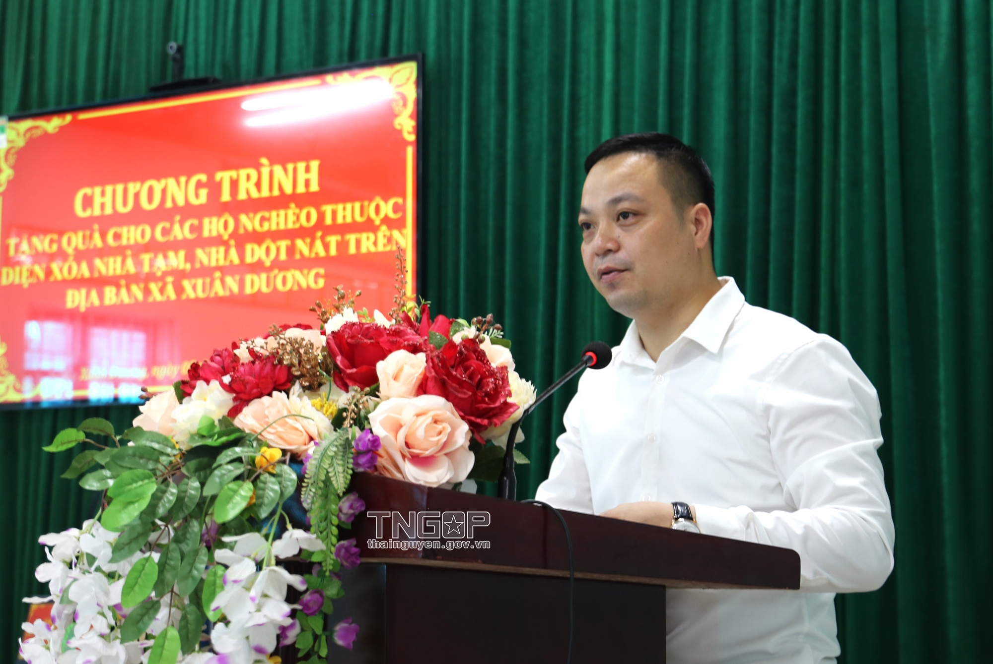 Đồng chí Nông Văn Phong, Chủ tịch UBND xã Xuân Dương phát biểu cảm ơn sự quan tâm, hỗ trợ của lãnh đạo tỉnh và doanh nghiệp đối với công tác xóa nhà tạm, nhà dột nát trên địa bàn xã