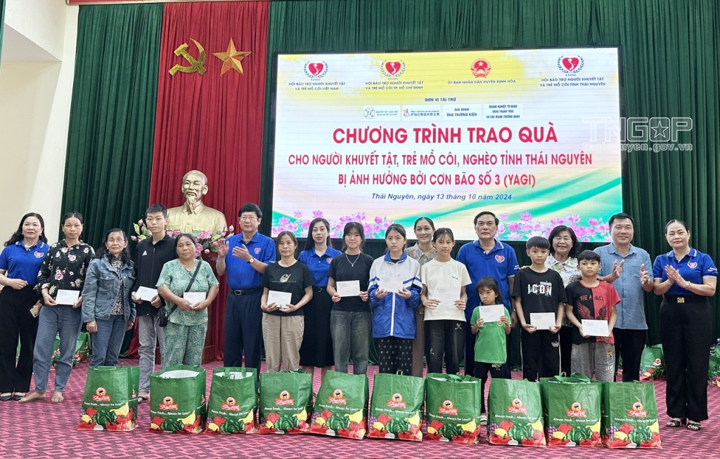 Sáng 13/10, Hội Bảo trợ người khuyết tật và trẻ mồ côi Việt Nam phối hợp với Hội Bảo trợ người khuyết tật và trẻ mồ côi Thành phố Hồ Chí Minh, Hội Bảo trợ người khuyết tật và bảo vệ quyền trẻ em tỉnh Thái Nguyên tổ chức Chương trình trao quà cho người khuyết tật, trẻ mồ côi, hộ nghèo trên địa bàn huyện Định Hóa bị ảnh hưởng bởi bão số 3.