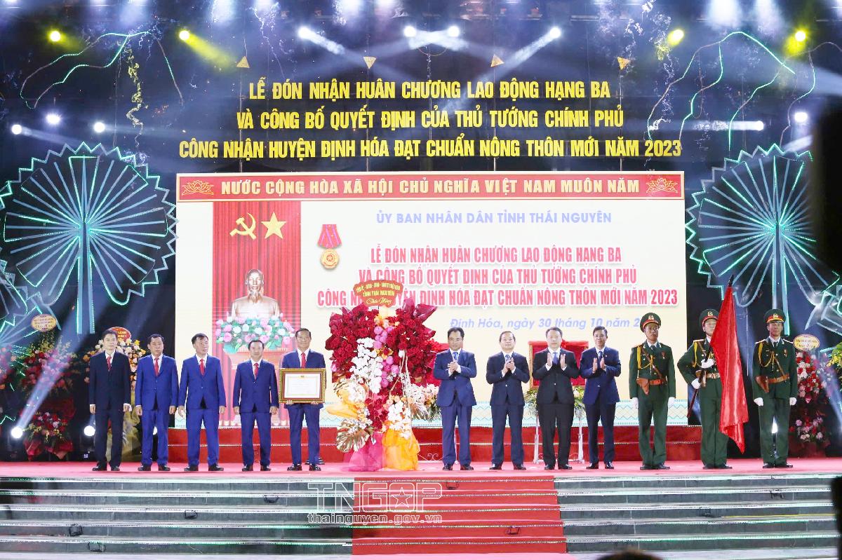 Tối ngày 30/10, UBND tỉnh Thái Nguyên long trọng tổ chức Lễ đón nhận Huân chương Lao động hạng Ba và công bố quyết định của Thủ tướng Chính phủ công nhận huyện Định Hóa đạt chuẩn nông thôn mới (NTM) năm 2023.