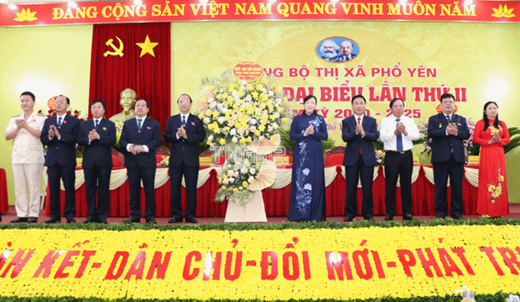 Các đồng chí lãnh đạo tỉnh tặng hoa chúc mừng Đại hội đại biểu Đảng bộ TP. Phổ Yên lần thứ II, nhiệm kỳ 2020 - 2025