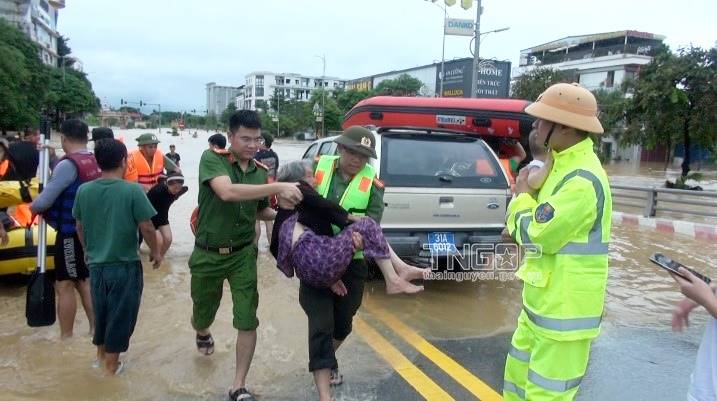 Trong những ngày qua, Ban Chỉ huy quân sự (CHQS) và Công an TP. Thái Nguyên luôn đảm bảo quân số trực 100%; huy động hàng trăm lượt cán bộ, chiến sĩ phối hợp với các phường, xã sử dụng ca nô, xuồng máy… đi sâu vào các ngõ, đến từng gia đình để hỗ trợ người dân di chuyển tài sản, đưa người cao tuổi, phụ nữ, trẻ em ra khỏi khu vực ngập lụt. Cùng với đó, tăng cường lực lượng tuần tra, canh gác tại các vị trí cầu tràn, đường giao thông bị ngập sâu để tổ chức phân luồng đảm bảo an toàn cho người và phương tiện tham gia giao thông, kiên quyết không cho người và phương tiện lưu thông qua khu vực chưa đảm bảo an toàn… Thượng tá Ngô Xuân Long, Chỉ huy trưởng Ban CHQS TP. Thái Nguyên đánh giá: Dù đã có những biện pháp chuẩn bị trước đó, nhưng lũ dâng nhanh, nhiều nơi nước ngập sâu đến 3 - 4 m, hàng nghìn hộ phải sơ tán, nhiều người mắc kẹt giữa biển nước trong điều kiện thiếu thức ăn, nước uống… Từ ngày 8/9, Ban CHQS thành phố đã huy động lực lượng chạy đua với thời gian, kịp thời chuyển các nhu yếu phẩm đến tay bà con vùng lũ, tìm kiếm người bị mắc kẹt ở những vùng ngập sâu, với phương châm “bảo đảm tính mạng cho Nhân dân là trên hết”.