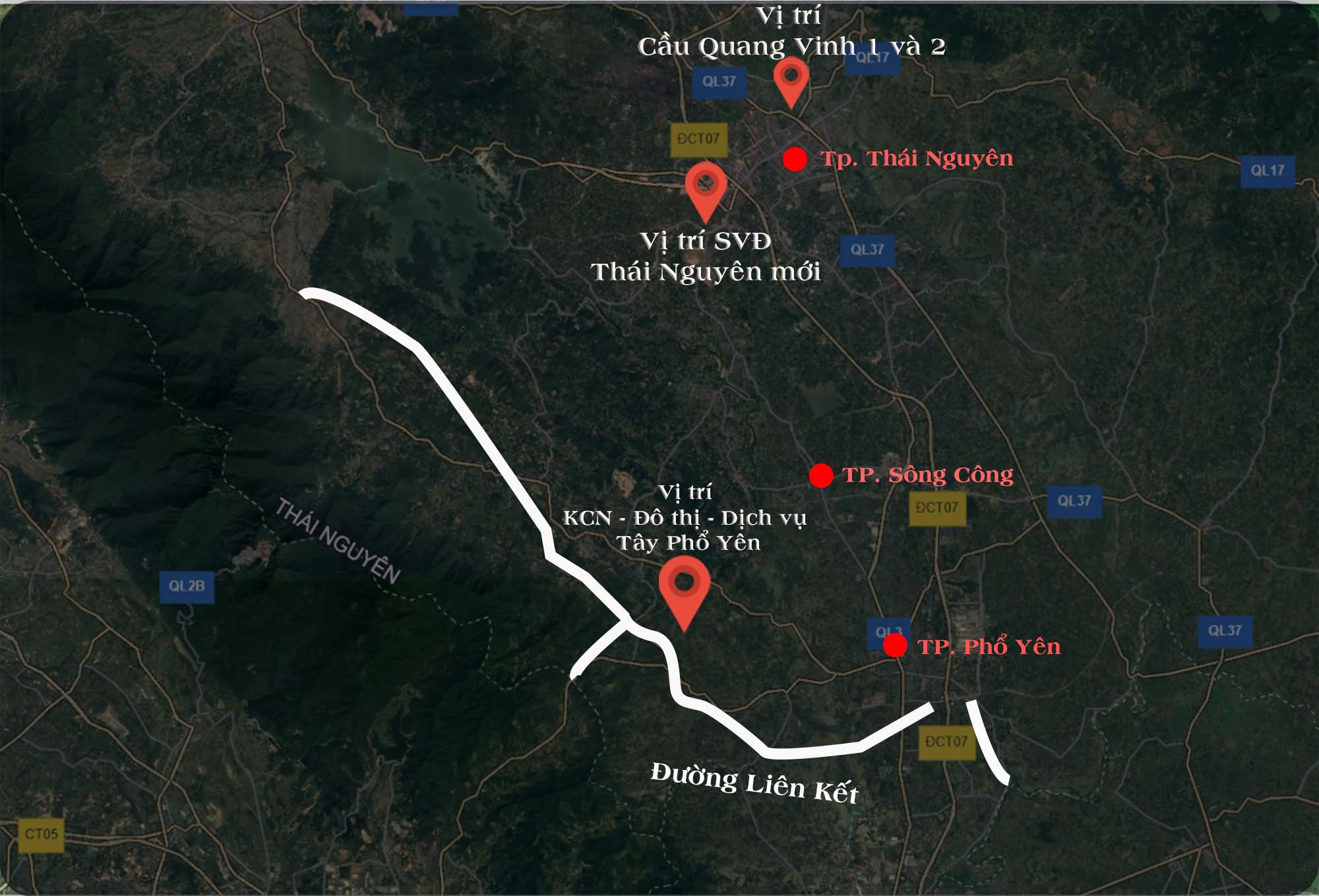 Để thực hiện mục tiêu trên, hiện nay trên địa bàn tỉnh Thái Nguyên đã quy hoạch, triển khai nhiều dự án, công trình trọng điểm với mức đầu tư từ hàng trăm đến hàng nghìn tỷ đồng có thể kể đến như: Đường liên kết tỉnh; sân vận động Thái Nguyên mới; cầu Quang Vinh 1 và 2; Khu công nghiệp - Đô thị - Dịch vụ Tây Phổ Yên…