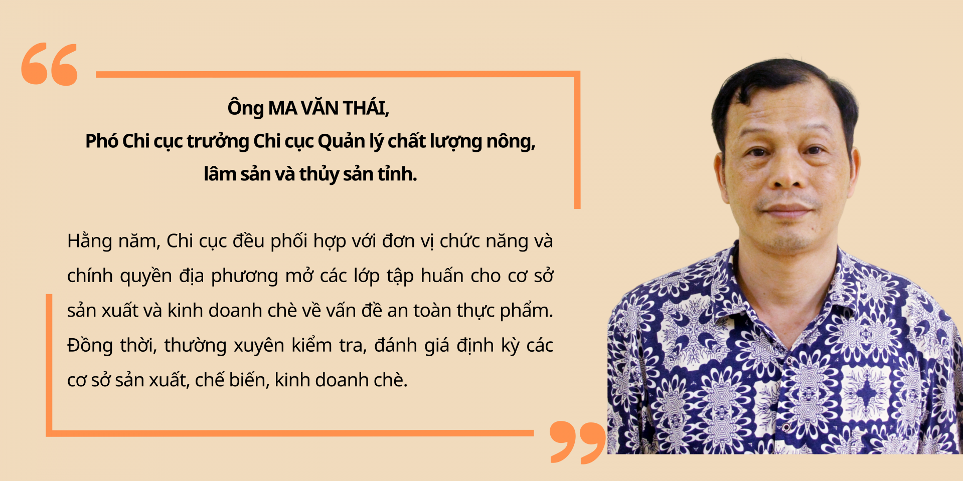 Từ năm 2020 đến nay, Sở Nông nghiệp và PTNT đã triển khai, tuyên truyền, hướng dẫn xây dựng thiết lập mã vùng trồng chè. Hiện, trên địa bàn tỉnh quản lý, giám sát 45 mã vùng trồng chè (25 mã xuất khẩu và 20 mã nội tiêu), được gắn định vị trên hệ thống GPS nhằm truy xuất nguồn gốc sản phẩm và tuân thủ tốt các tiêu chí theo quy định. Cùng với sự hỗ trợ của tỉnh, các doanh nghiệp, HTX, người trồng chè đã đặc biệt quan tâm xây dựng thương hiệu gắn với quảng bá, tiêu thụ sản phẩm.