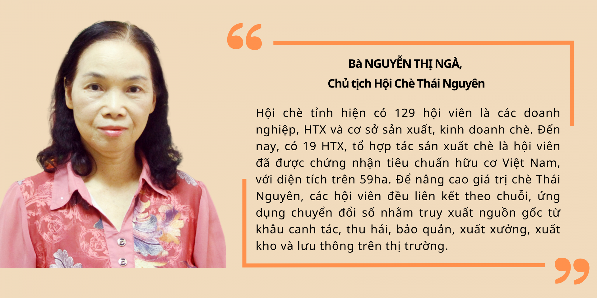 Theo Tiến sĩ Nguyễn Hữu Tài, Chủ tịch Hiệp hội Chè Việt Nam: Hạn chế lớn nhất của Thái Nguyên là vùng nguyên liệu manh mún, mô hình sản xuất nhỏ lẻ, dẫn tới việc quản lý chất lượng chè gặp nhiều khó khăn. Trong khi đó, yêu cầu về an toàn vệ sinh thực phẩm đang ngày một cao và khắt khe hơn. Do đó, việc xây dựng các mô hình HTX, liên kết sản xuất giữa các hộ gia đình là hết sức cần thiết. Để cây chè phát triển bền vững, tỉnh cần rà soát, quy hoạch tổng thể trồng và chế biến chè theo chuỗi giá trị từ hạ tầng kỹ thuật đến các hoạt động phụ trợ, dịch vụ, thương mại, kết hợp du lịch sinh thái vùng chè, đáp ứng yêu cầu sản xuất, chế biến an toàn tiến tới sản xuất theo hướng hữu cơ.