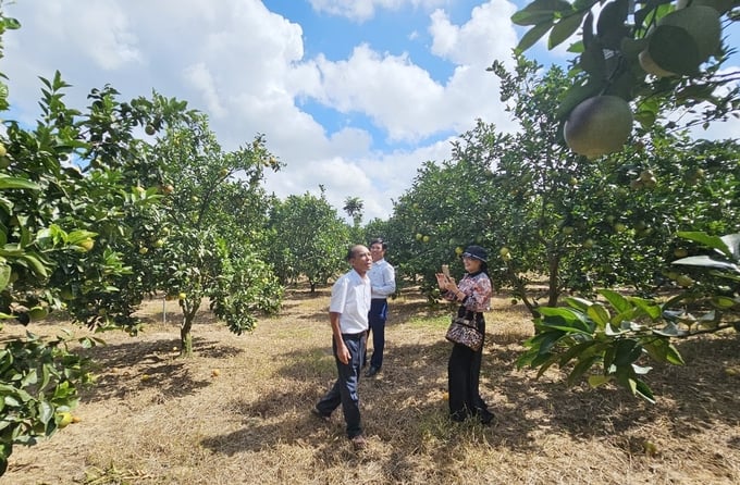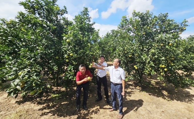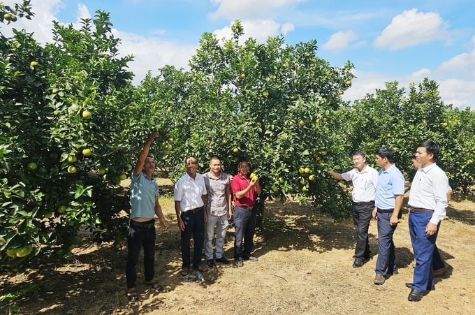 Nhiều người trồng cam ở các địa phương đến tham quan, học hỏi kinh nghiệm trồng cam tại trang trại của ông Mai. Ảnh: Tâm Đức.